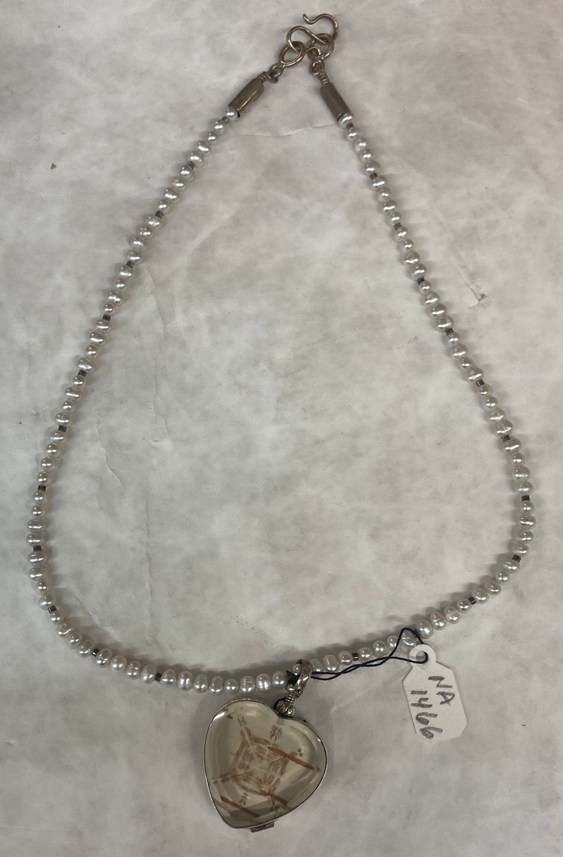 NA1466. Heart shaped glass pendant, birchbark with a scratched design inside the pendant. Pendant is framed with silver along edges. Natural pearl beads with small square beads between every 4 or so pearls. Hook style clasp on back of necklace.Made/Created
