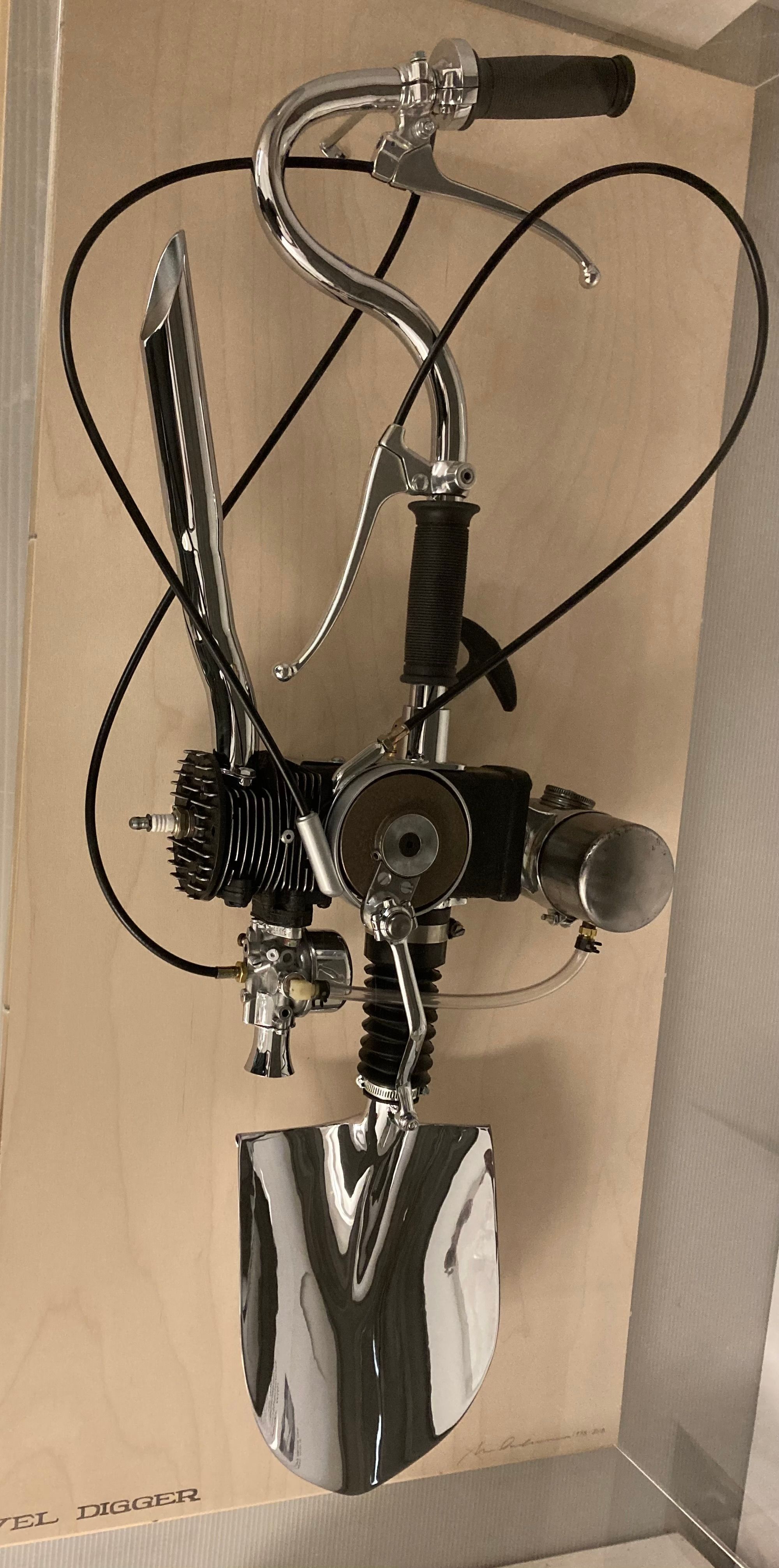 Shovel with motor and curved handle. Wood backed display case.Made/Created