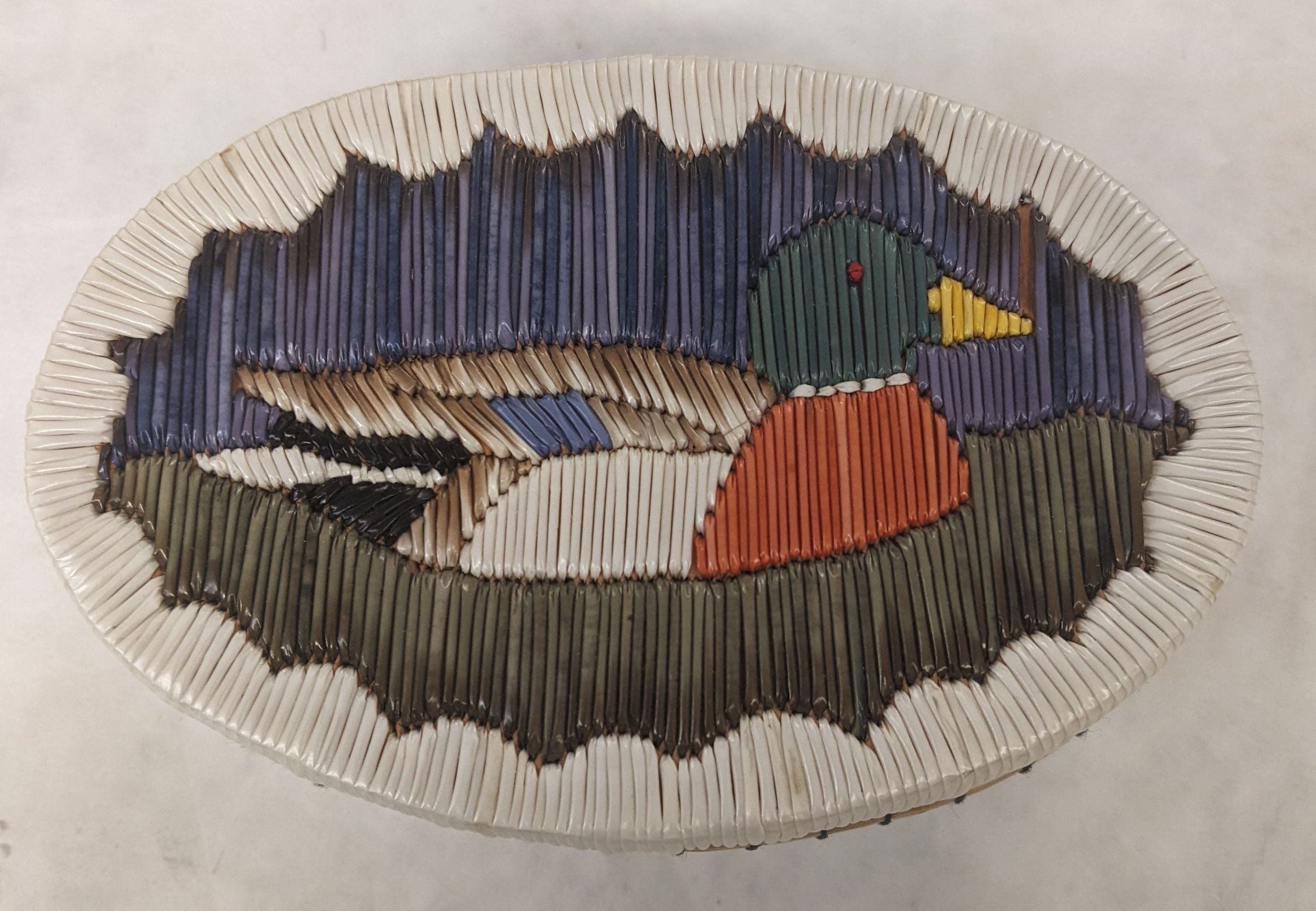 NA0915 a. Birchbark container depicting a mallard duck - in profile facing right - in quillwork.Dimensions