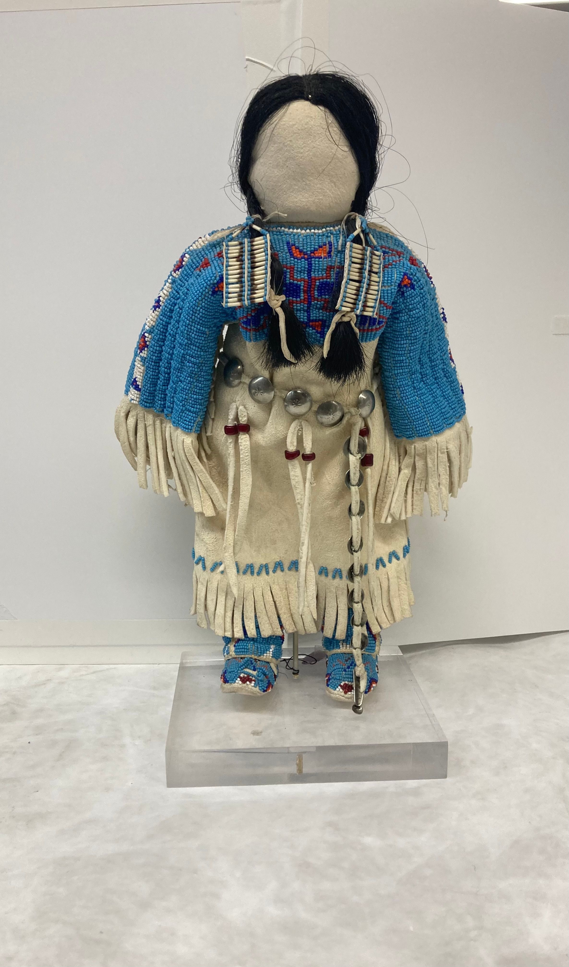 NA0423 a. Female doll made from buckskin wearing a beaded dress and moccasins in blue/red/white/orange. Cerulean blue majority on dress and moccasins. Her hair is in two braids with quill and bead decorations. Dress has a leather belt with silver disc ornaments.Made/Created