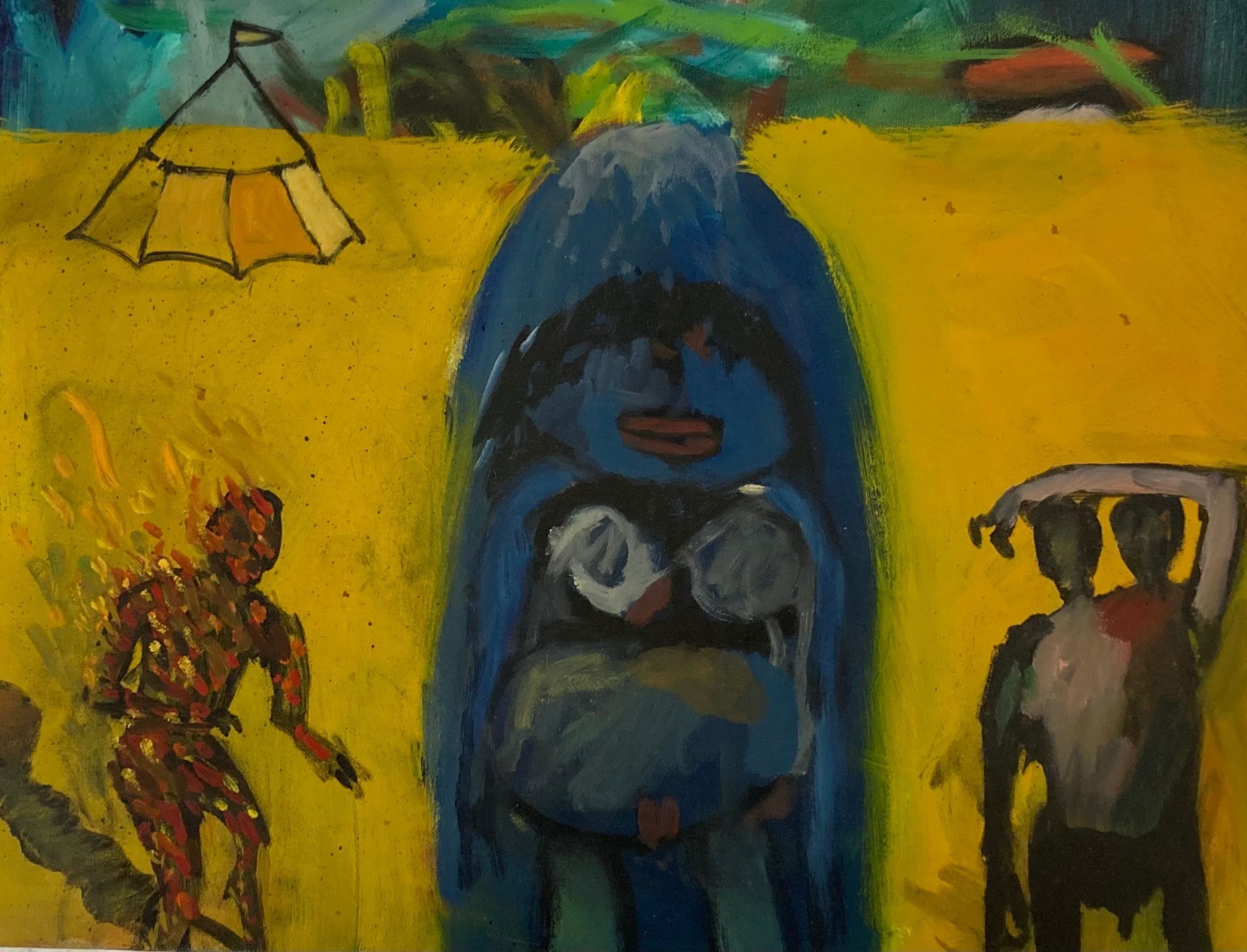 Circus Series. 86. Yellow fore/midground with variegated greens and browns in background. Central blue figure with a figure on fire to the left and a 2 headed figure to the right. Circus tent in the back left.Dimensions