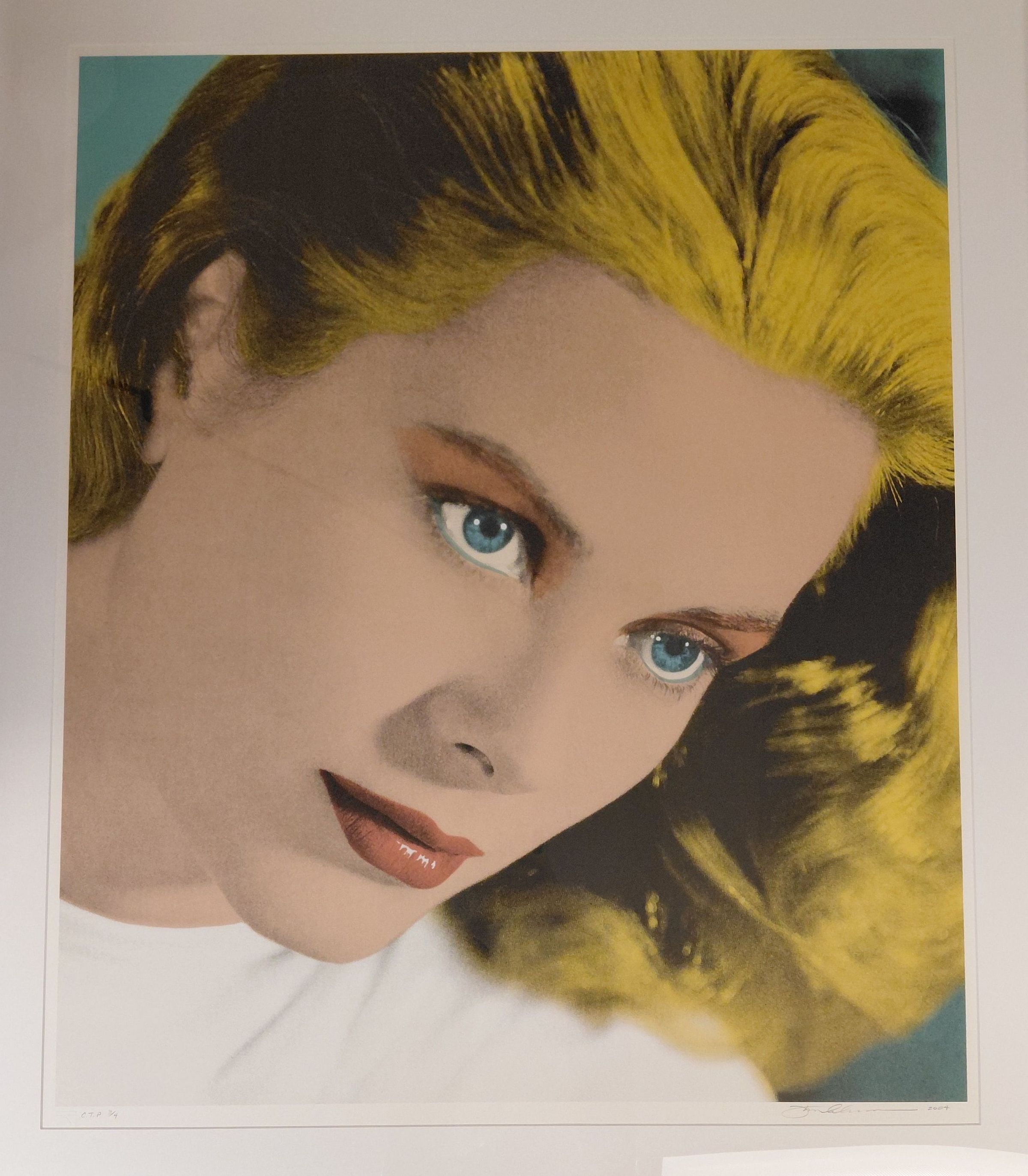 SMA-G-103. Three quarters view of woman's face, looking to right side of image. Blonde, light blue eyeliner, bright blue eyes, red lips, orange eyeshadow. "Color applied by digital inkjet; black 'key plate' applied with hand lithography' framed by Museum Services.Artwork Details