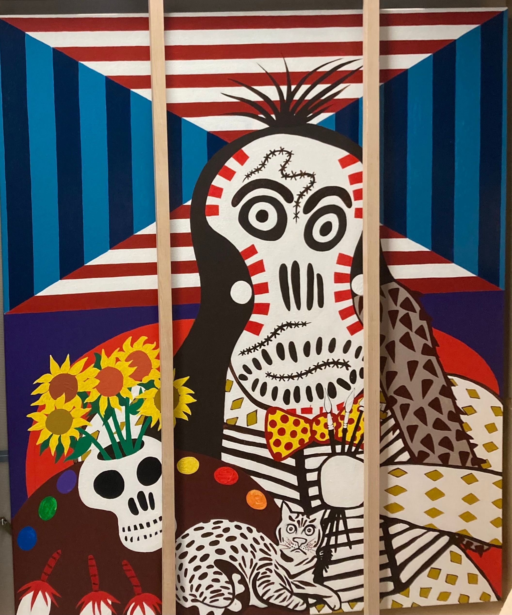 acrylic. Figure holding paintbrushes, cat in bottom center. Skull with flowers in it. Background has stripes that form rectangles in red/white and light blue/dark blue.Made/Created