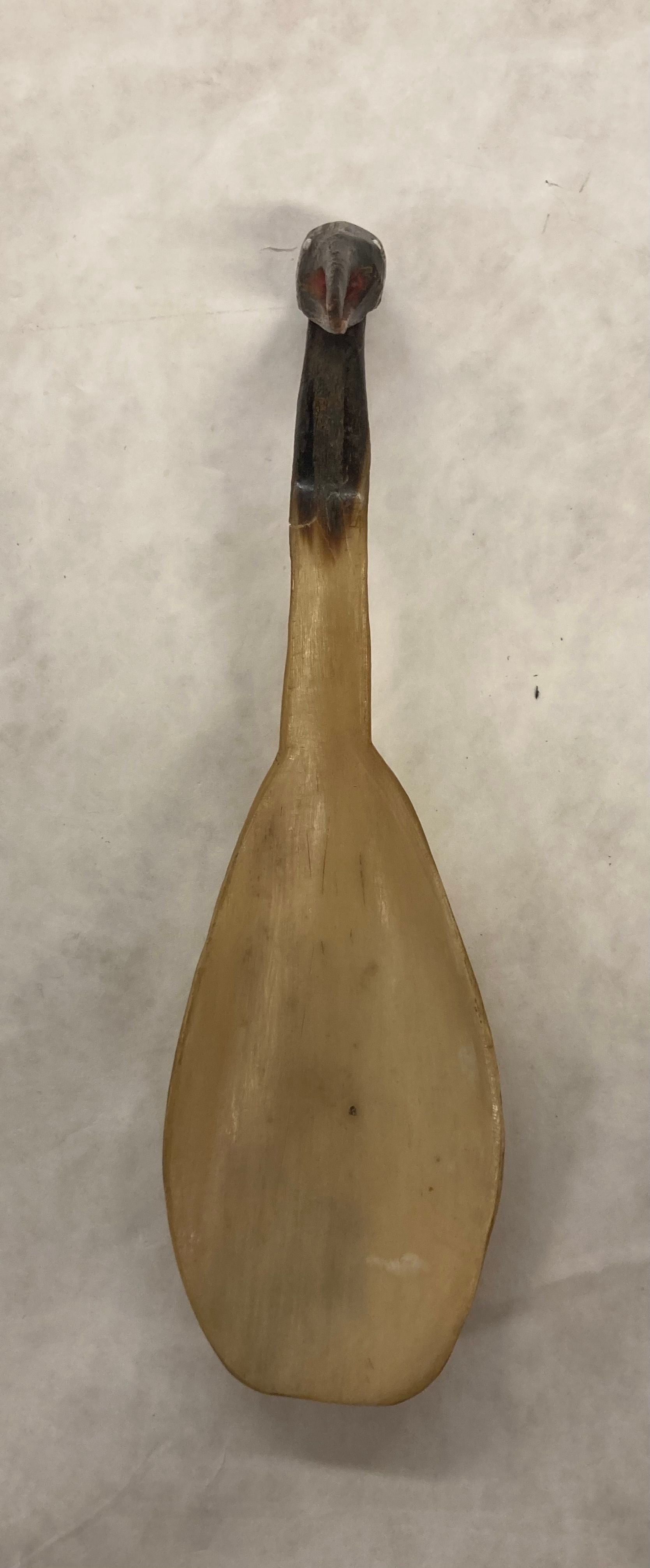 NA0431, tan/cream in color, handle is shaped like a bird (possible a crane), the handle is the neck of the crane with the head making the base of the ladle handle. The bird's eyes are made from white beads, the inner mouth is painted red.Made/Created