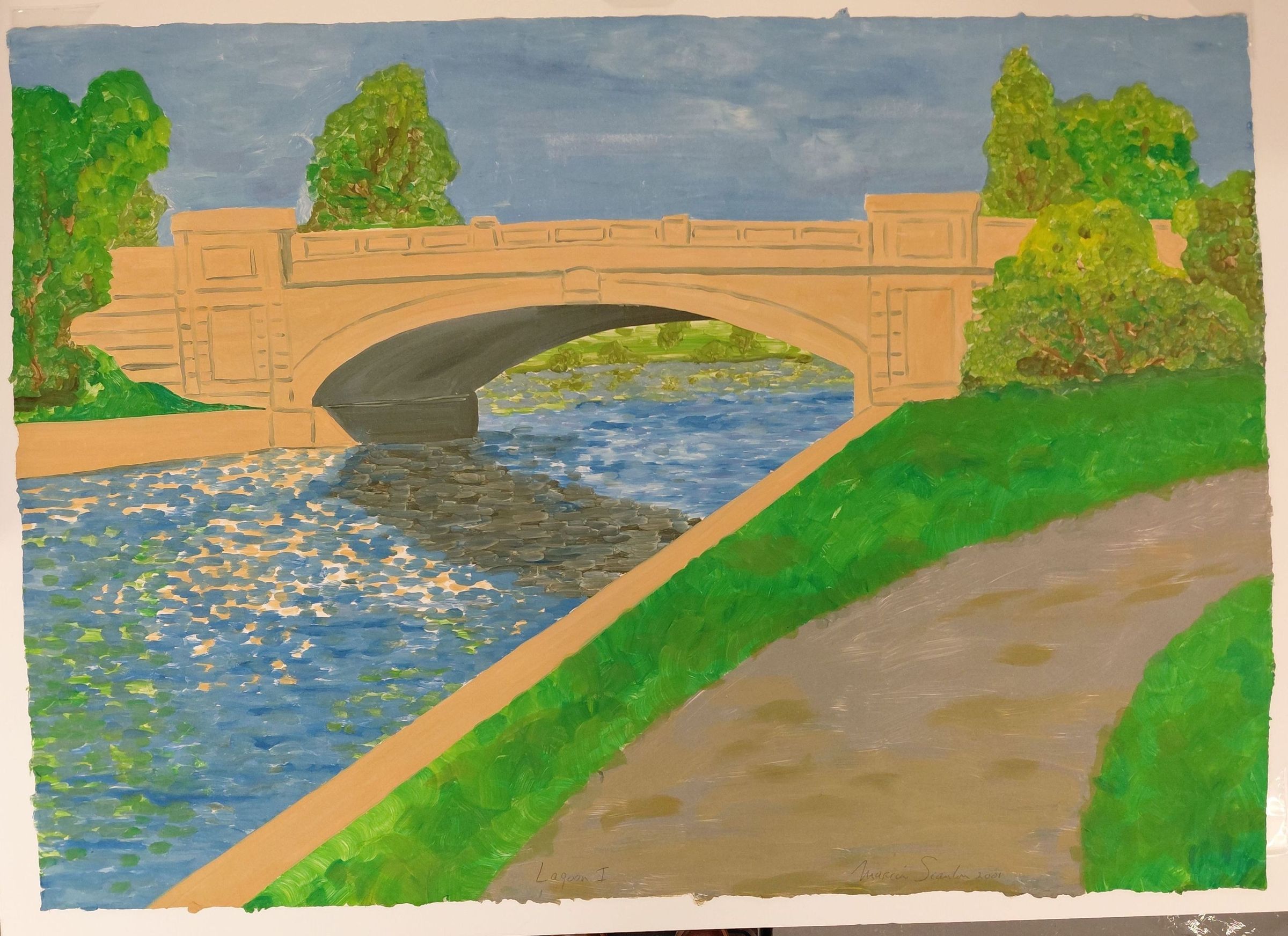 MS-0201. Tan colored bridge spanning a body of water. Path on bottom right of image. Blue sky and green trees.