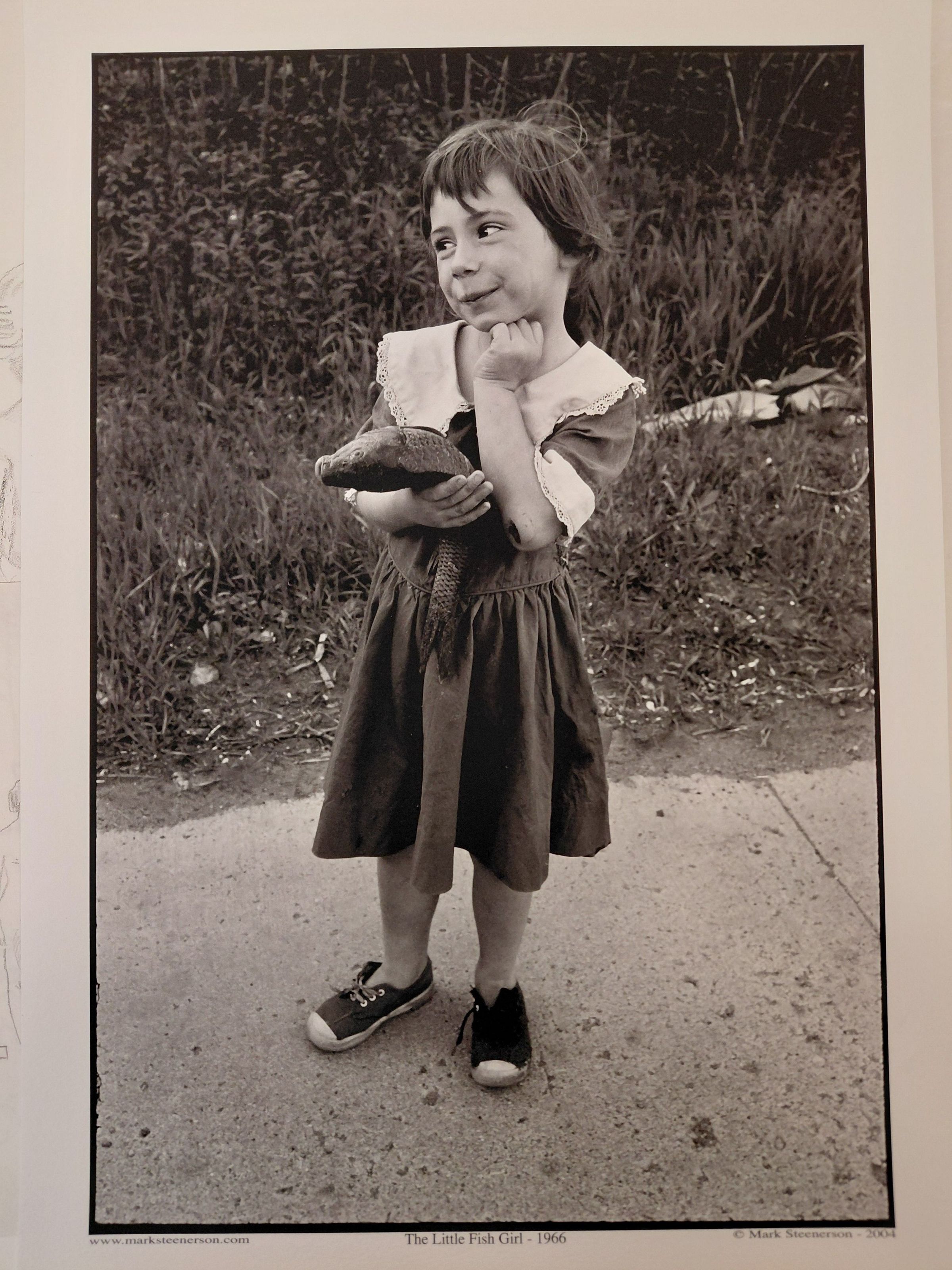 Little girls holding a fish in her right hand, wearing a dress with a white collar and sleeves. Looking away from the camera.