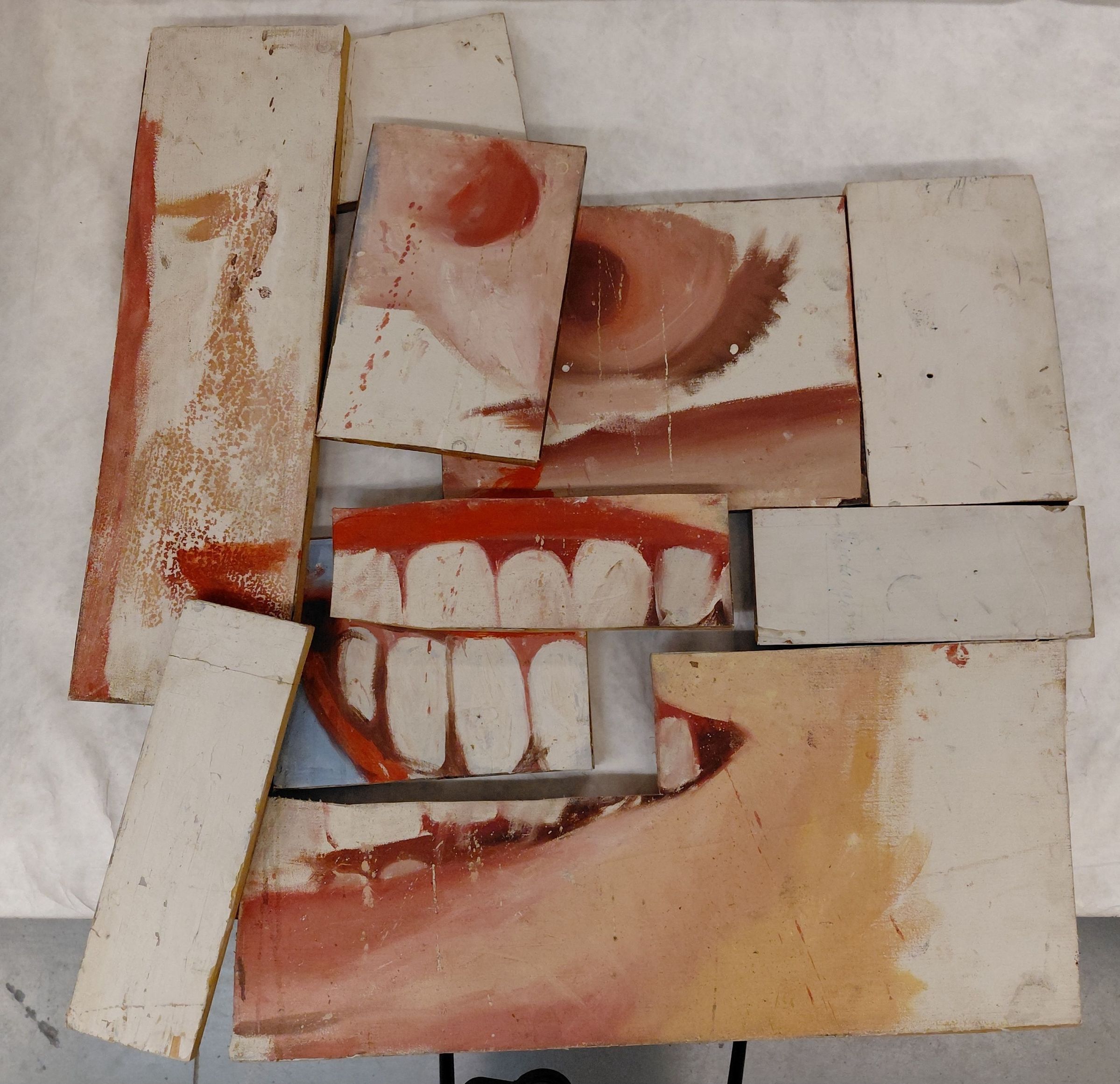 SMA45. Assemblage of a mouth and eye, different views mashed together on individual pieces of wood. Wood is layered and overlapping in some sections.Artwork Details