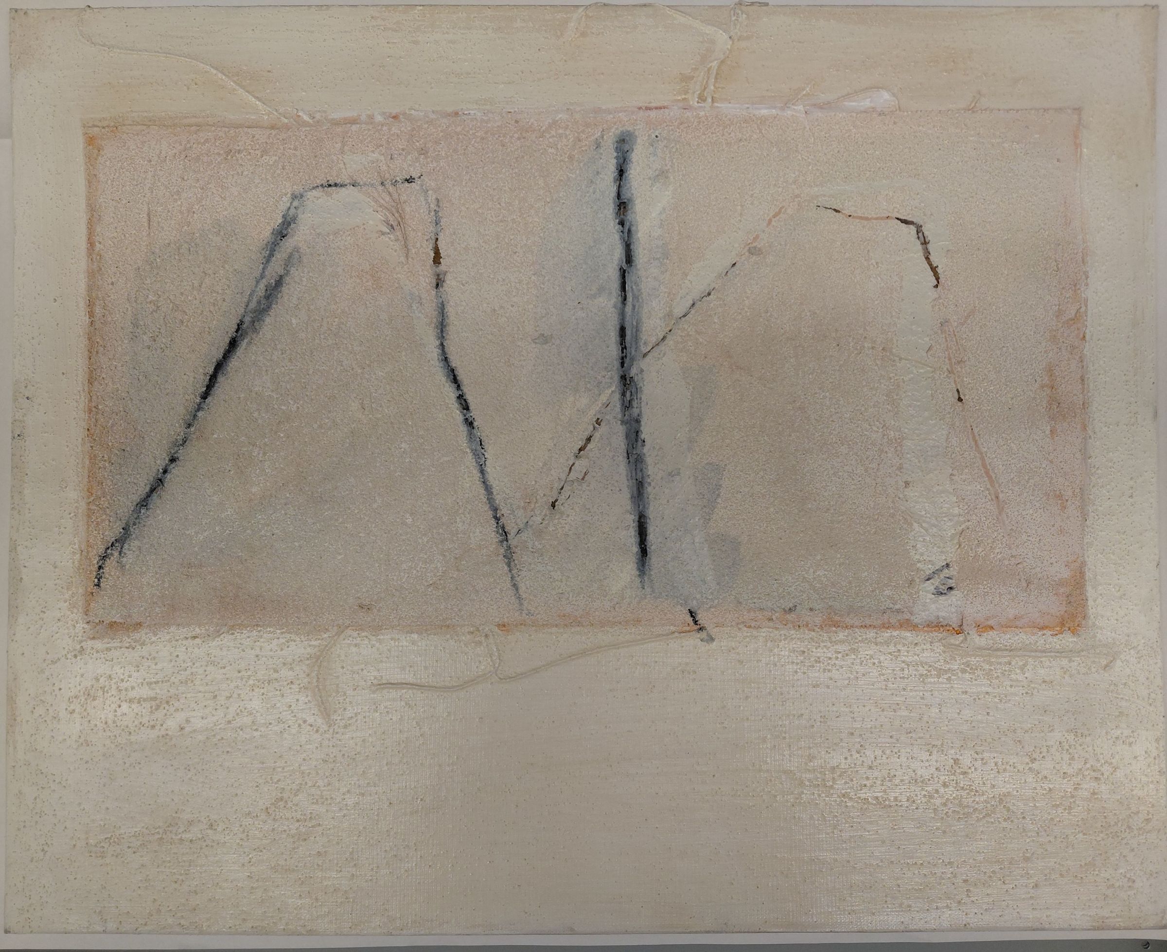 Light orange rectangle on a white background, two mountain forms in black, black line down the center between them.Artwork Details