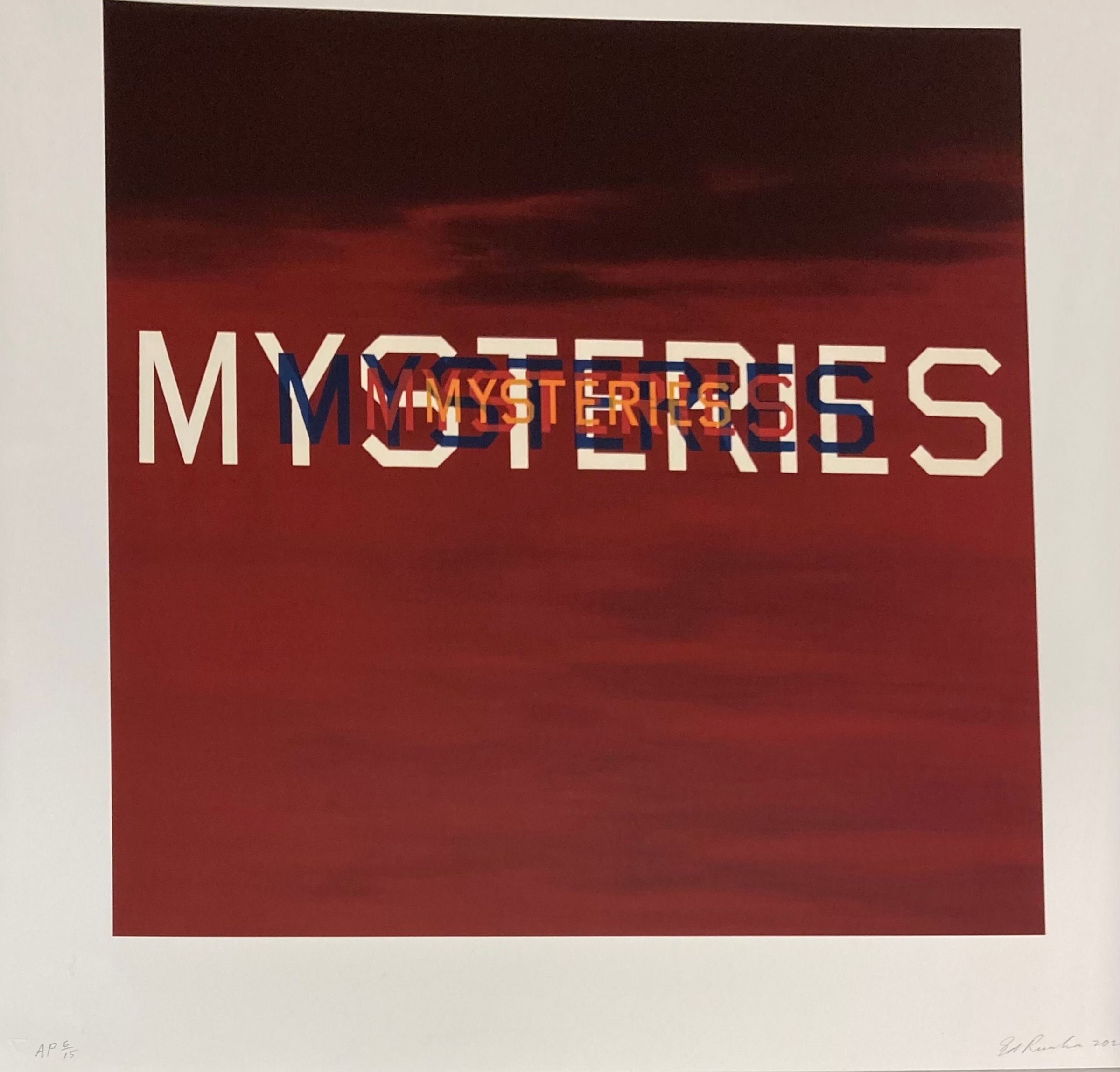 Ombre black to red background. Text "mysteries" overlaid at least 4 times.Edition