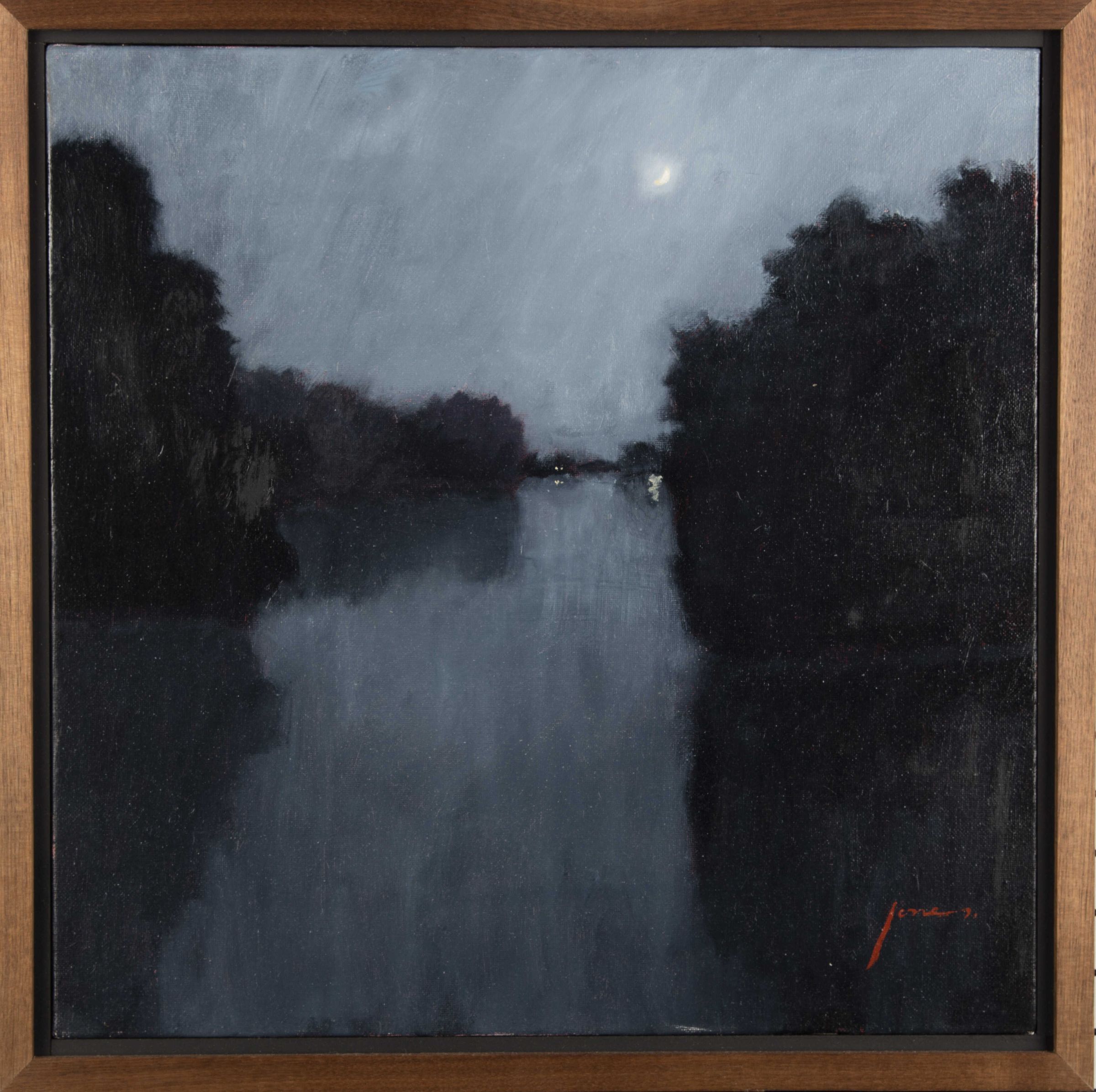 The view is of a dark, shadowed lake landscape. The tree's shadows reflect in the water creating two large dark shapes bracketing the sides of the canvas. The work holds a painterly quality with visible brushstrokes, shades of blue cover the whole canvas. A crescent moon is suspended in the night sky, and a few lights can be seen across the lake. The signature of the artist is in the bottom right corner in red - the only warm color used in the piece.Made/Created