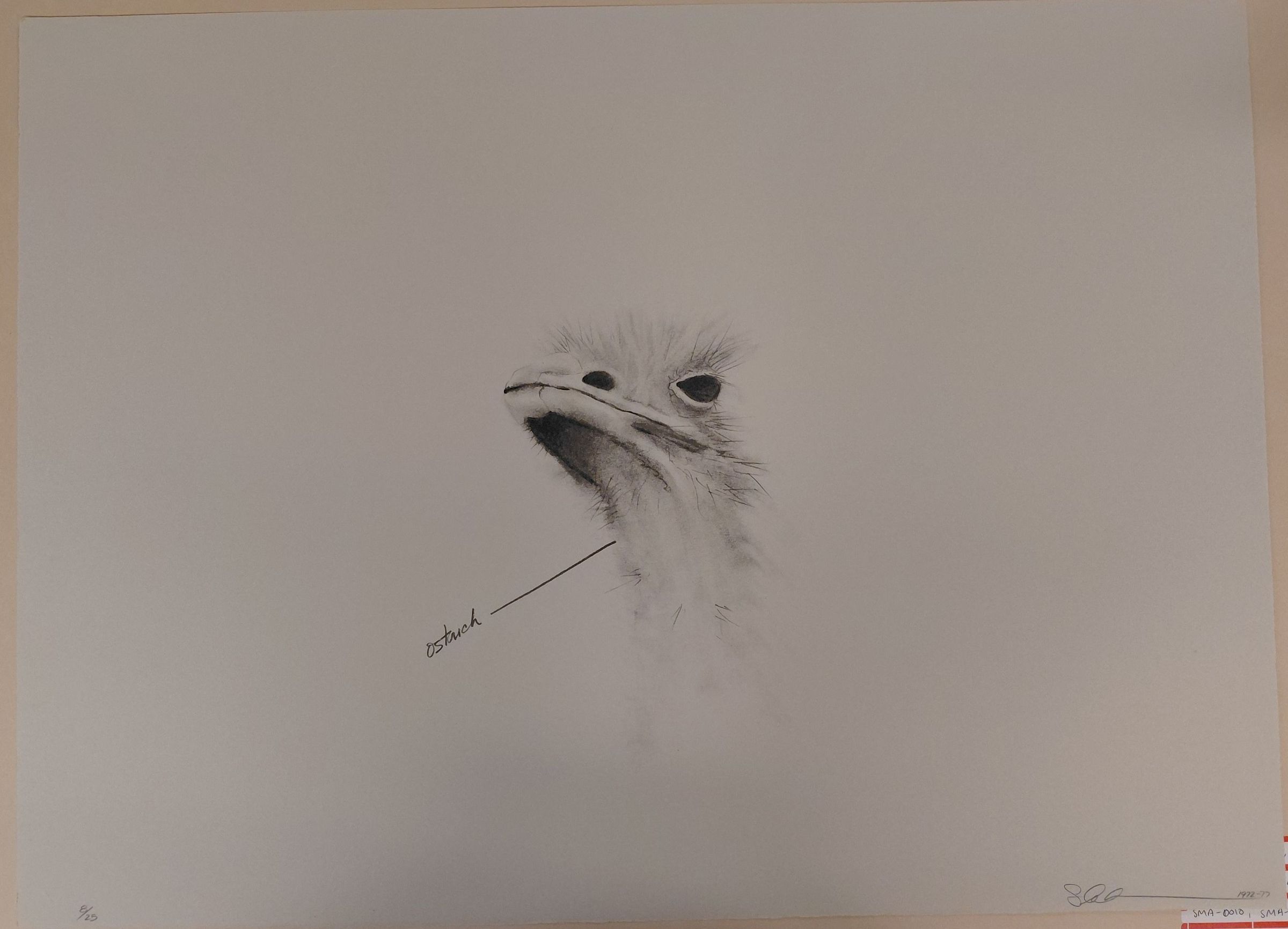 SMA-0015. Ostrich head, labeled "ostrich" with arrow pointing from left side of image.Made/Created