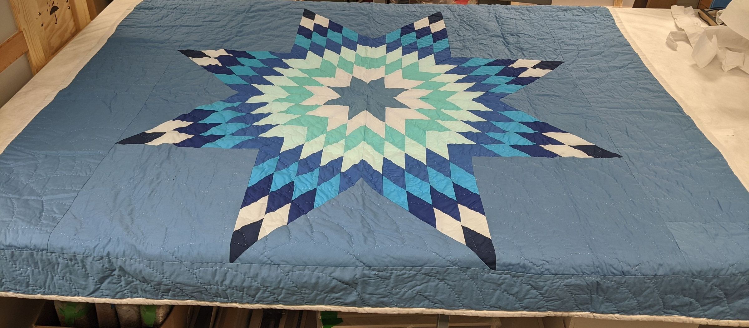 NA1064. Star design quilt with various blues and white. Trim and reverse side is white. quilting pattern is semi-circles, sort of like rainbows. Seems to be hand stitched.Materials
