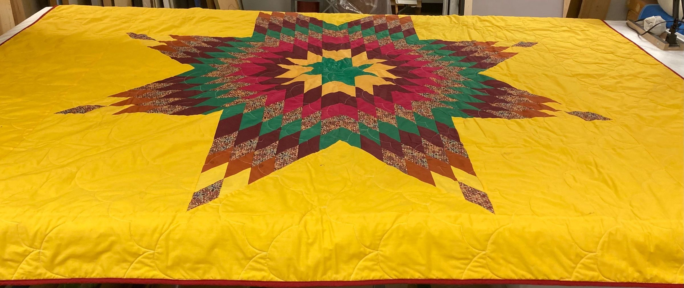 NA1165. Central star design in green/yellow/red/floral/brown on a yellow background. Red binding and backing. Scalloped quilting. Appears machine stitched.Made/Created