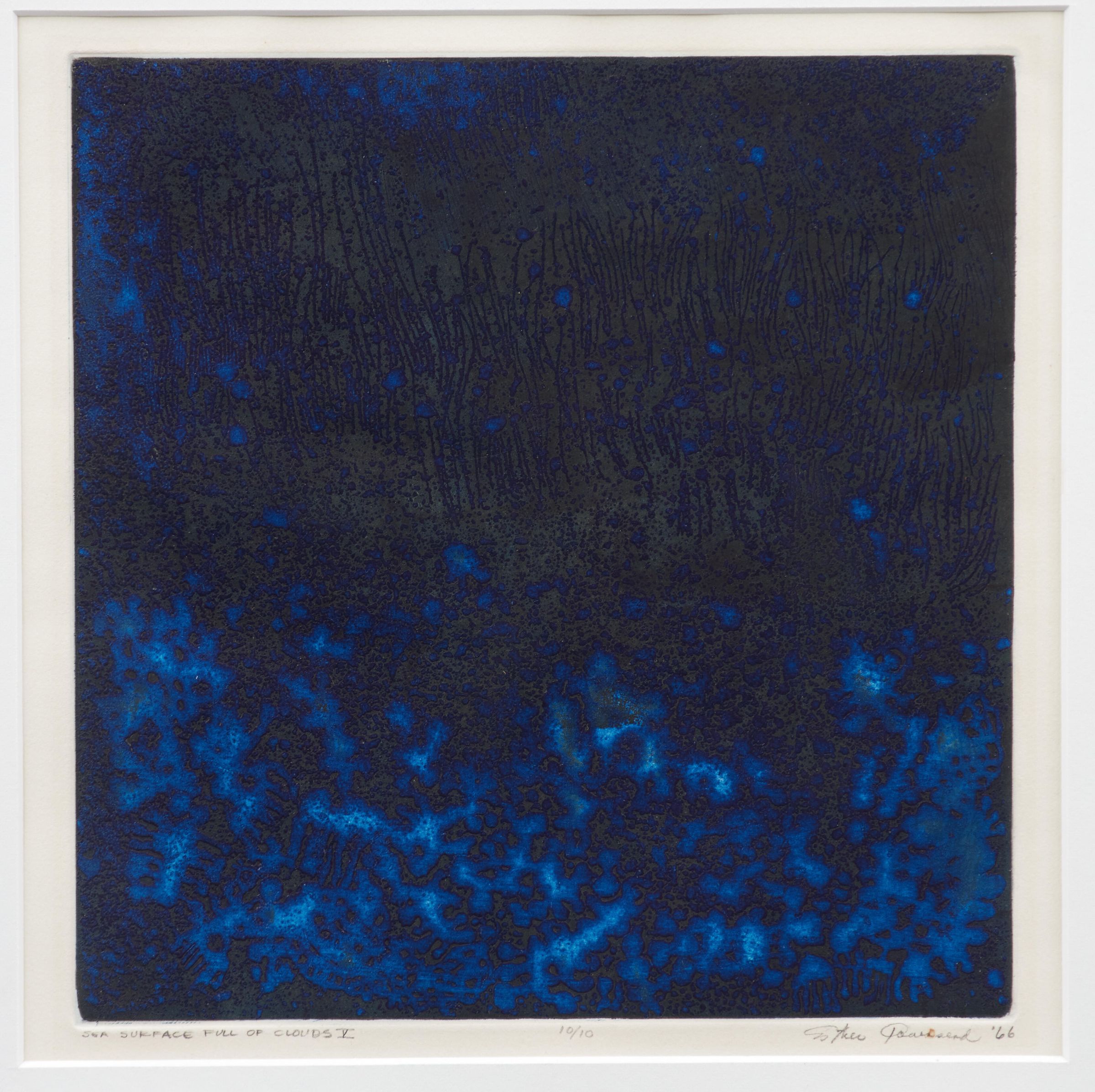 Abstract print with indications of clouds and seascape. Uses varied tones of blue.Made/Created