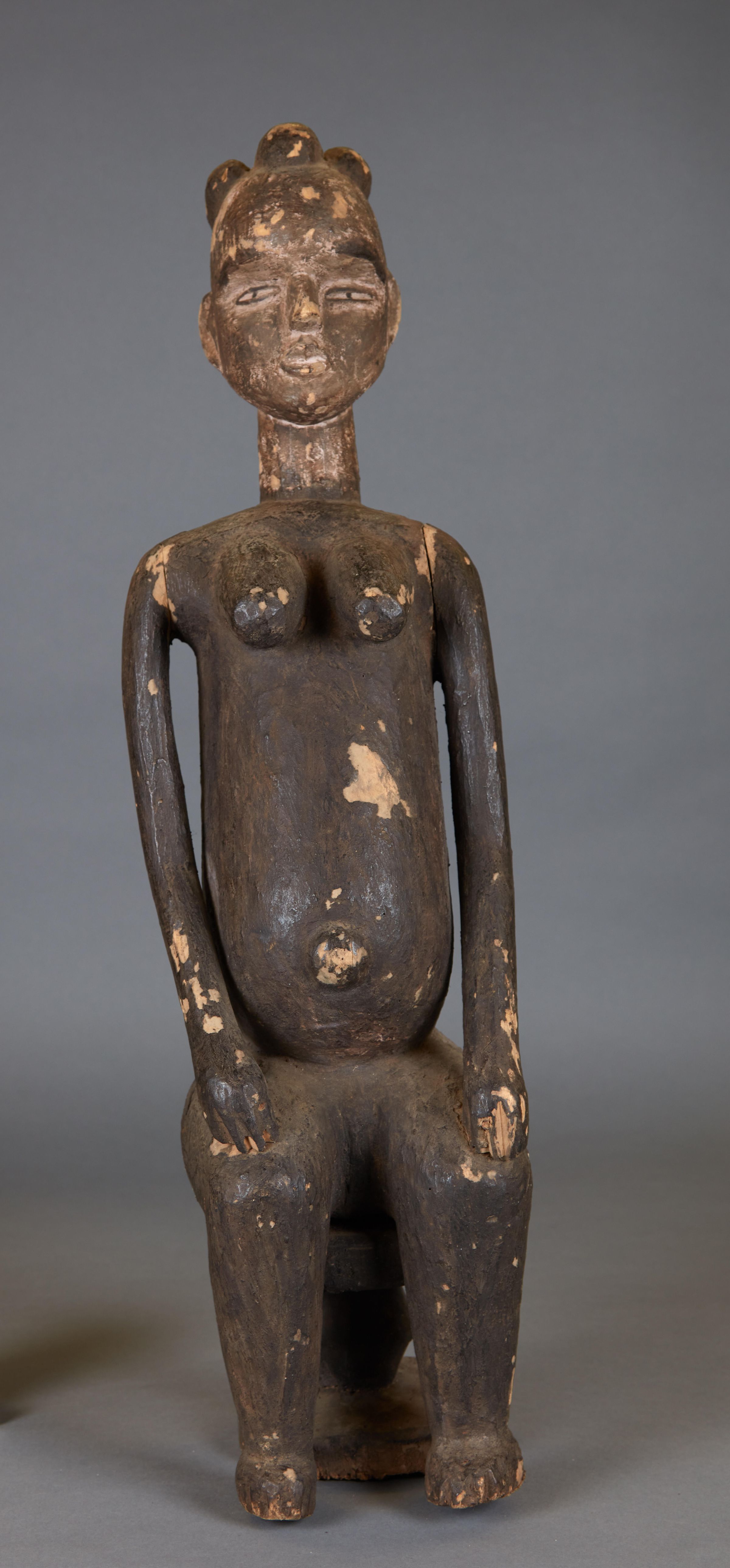 Wooden seated female ancestor figure created by a member of the Idoma TribeMade/Created