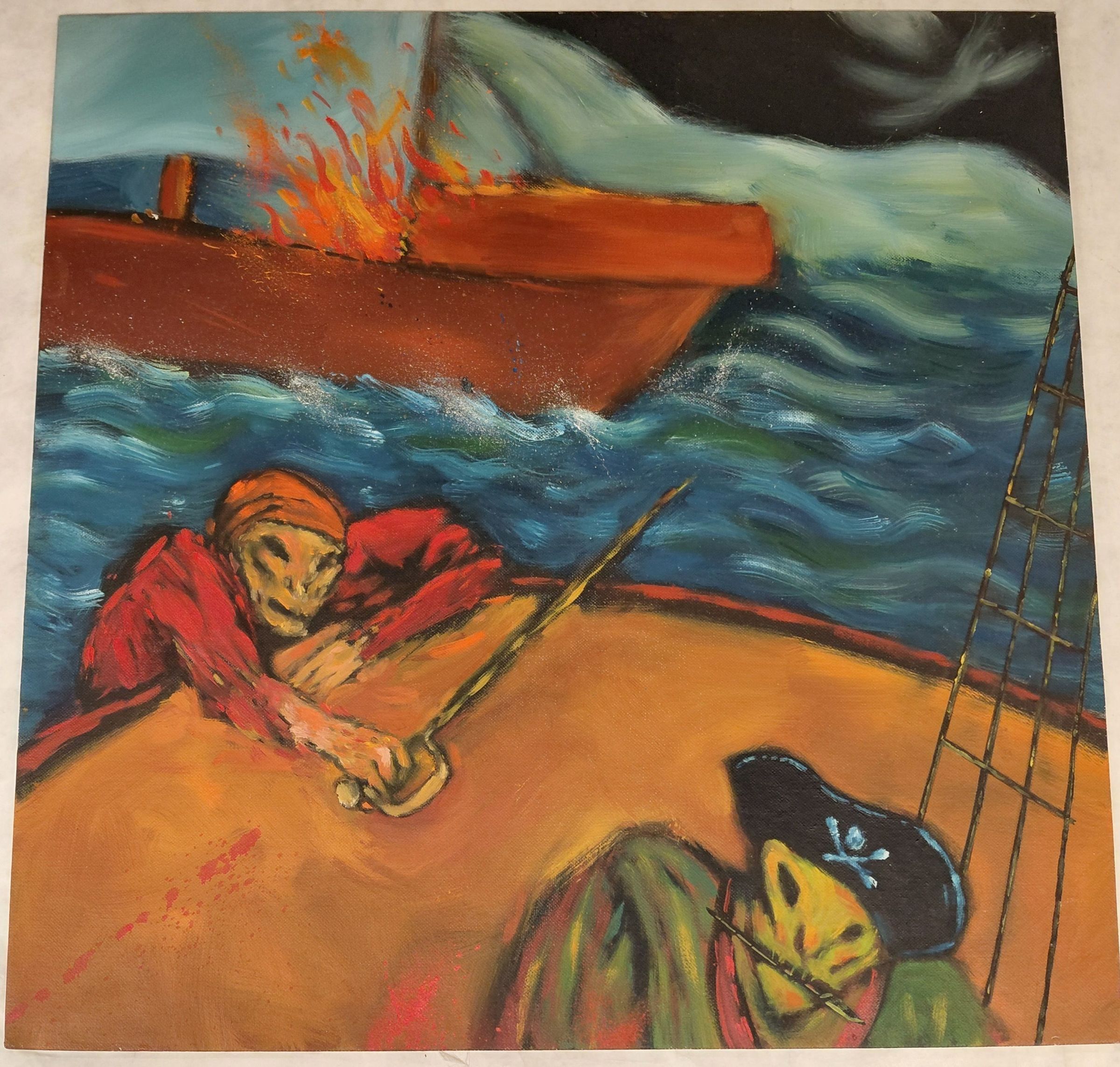 SMA 85. Two pirates, one climbing onto another's ship as a different ship burns in the background. One pirate has a knife in his mouth, other pirate climbing has a sword in his hand. Gestural brush strokes and dark color palette.