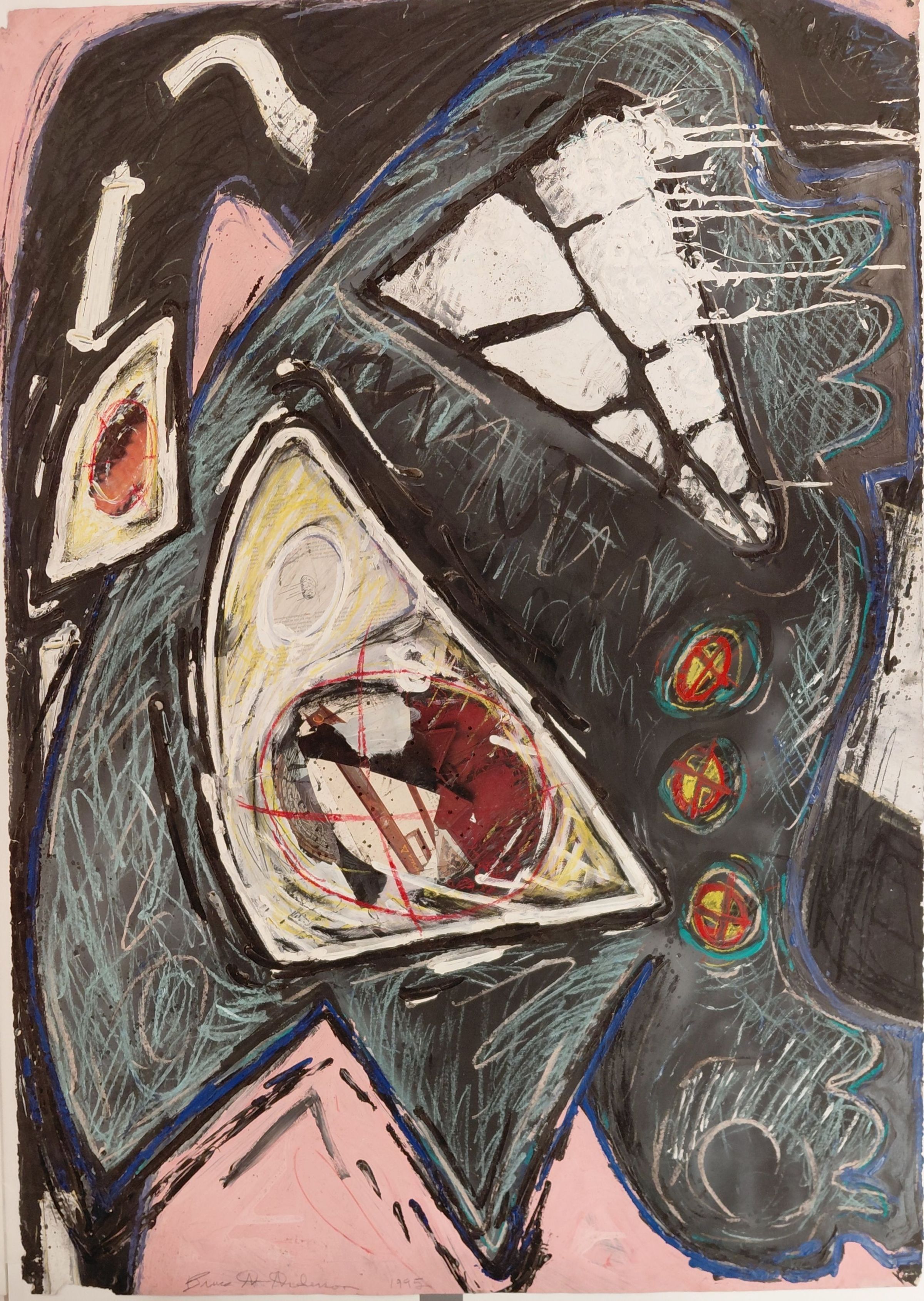 Abstract with a black background and white/yellow/pink triangular forms. Blue linear elements around forms.Artwork Details