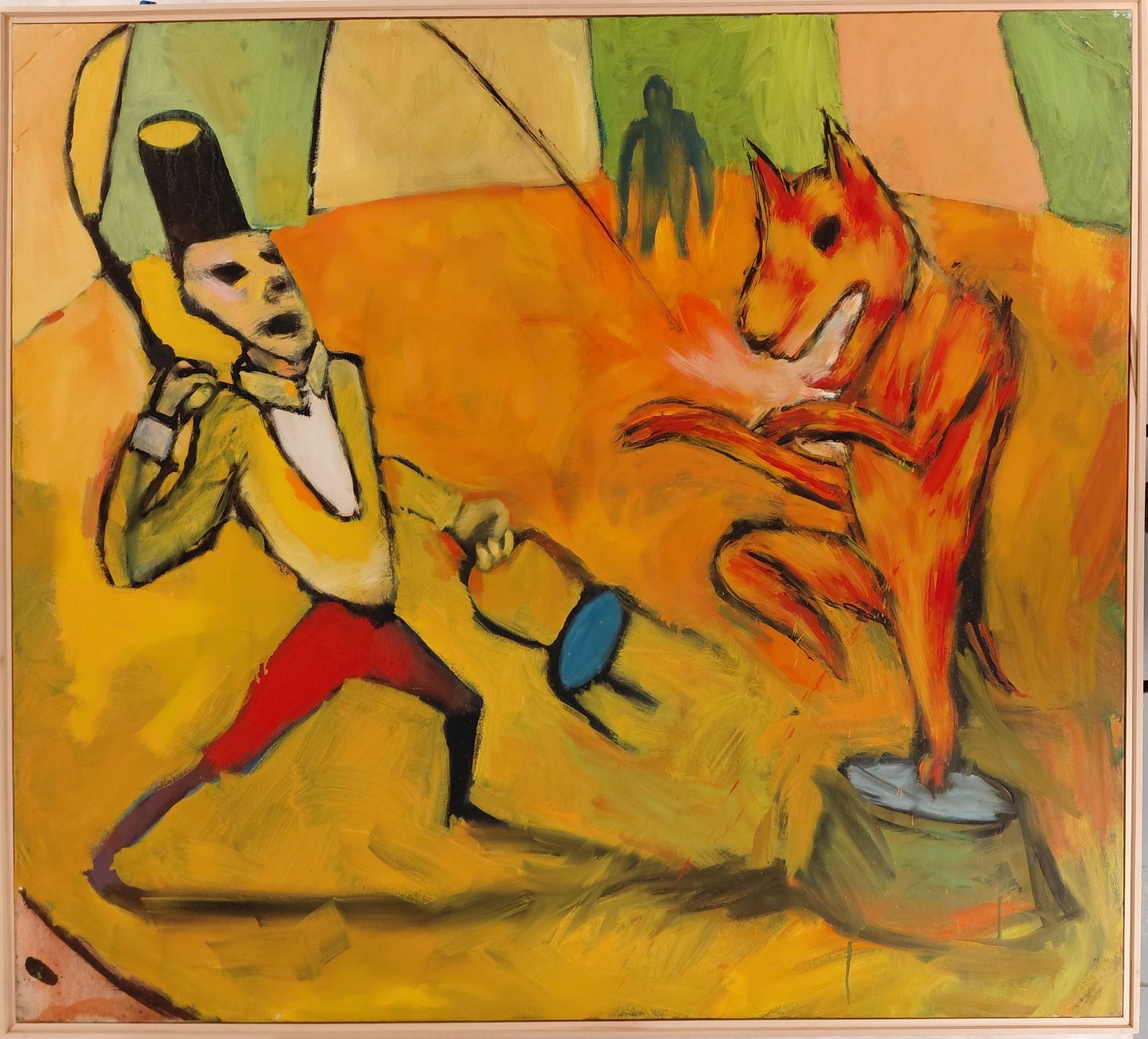 Circus Series. SMA88. Lion tamer with a black hat, yellow jacket, and red pants. Holding a blue chair and yellow stick. Lion-like figure on step stool/pedestal. Shadowed figure in background.