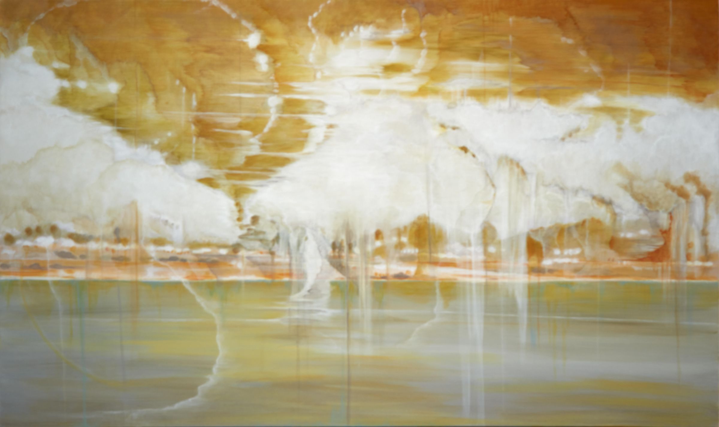 oil on canvas. Yellow/green/white organic forms. Some sections of paint spread downwards, white "clouds" take up the middle line of the painting. Bottom 1/3rd is mostly blue/grey and top 1/3rd is mostly yellow/orange.Made/Created