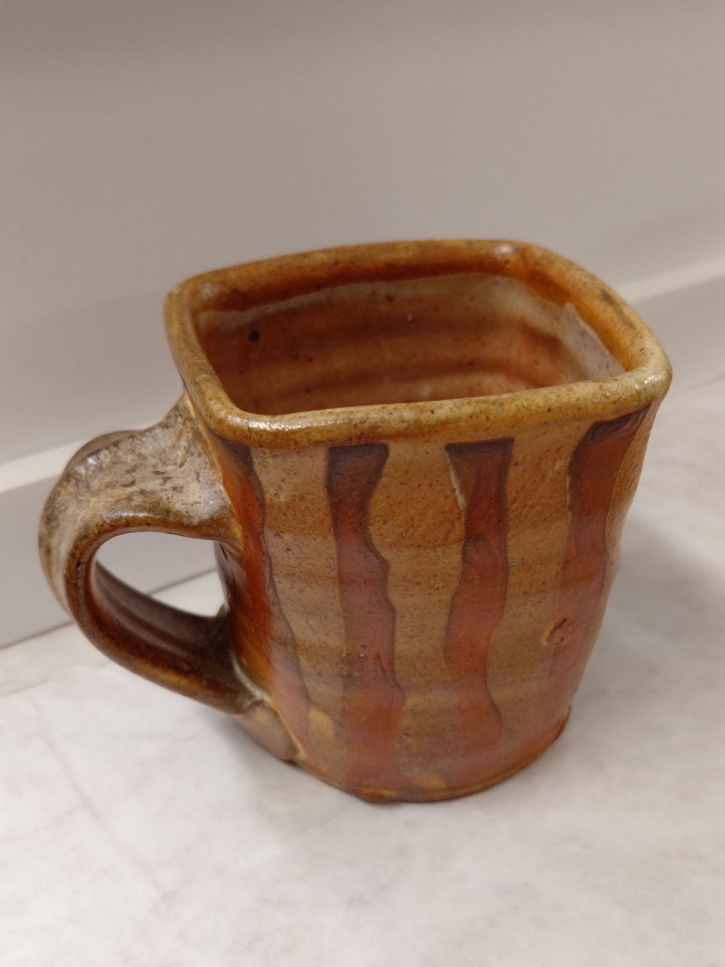 Stoneware, Shino type glaze, wood fired. Orange/red square-shaped mug. Red wavy lines on outside. Inside speckled with black. Thick handle with ridge in center.Artwork Details