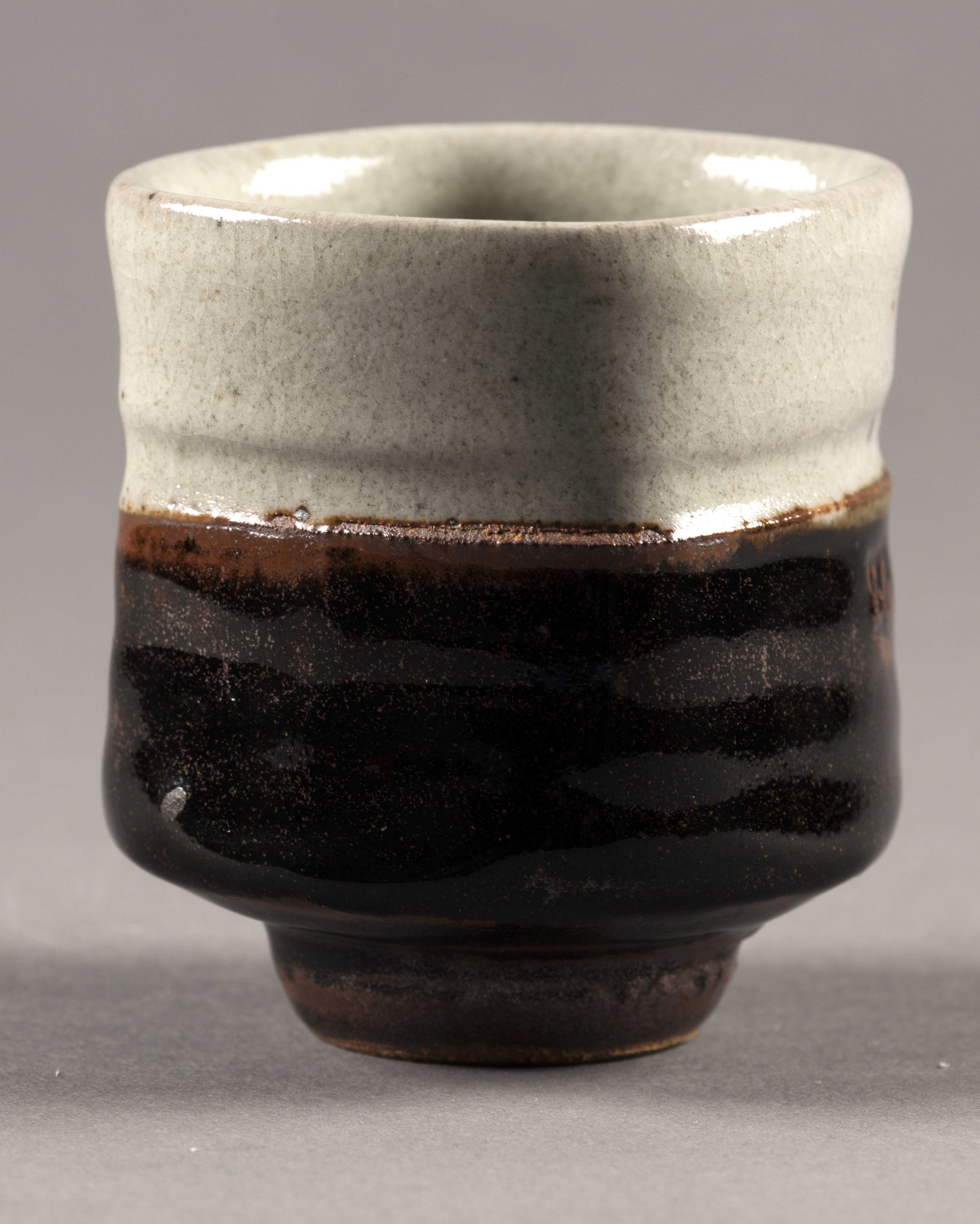 Glazed stoneware. Slightly rounded, squared with hourglass shape. Top half is slate grey in color. Bottom half is dark brown with hints of red. Stamp of artist on one side of cup: "GC".Made/Created