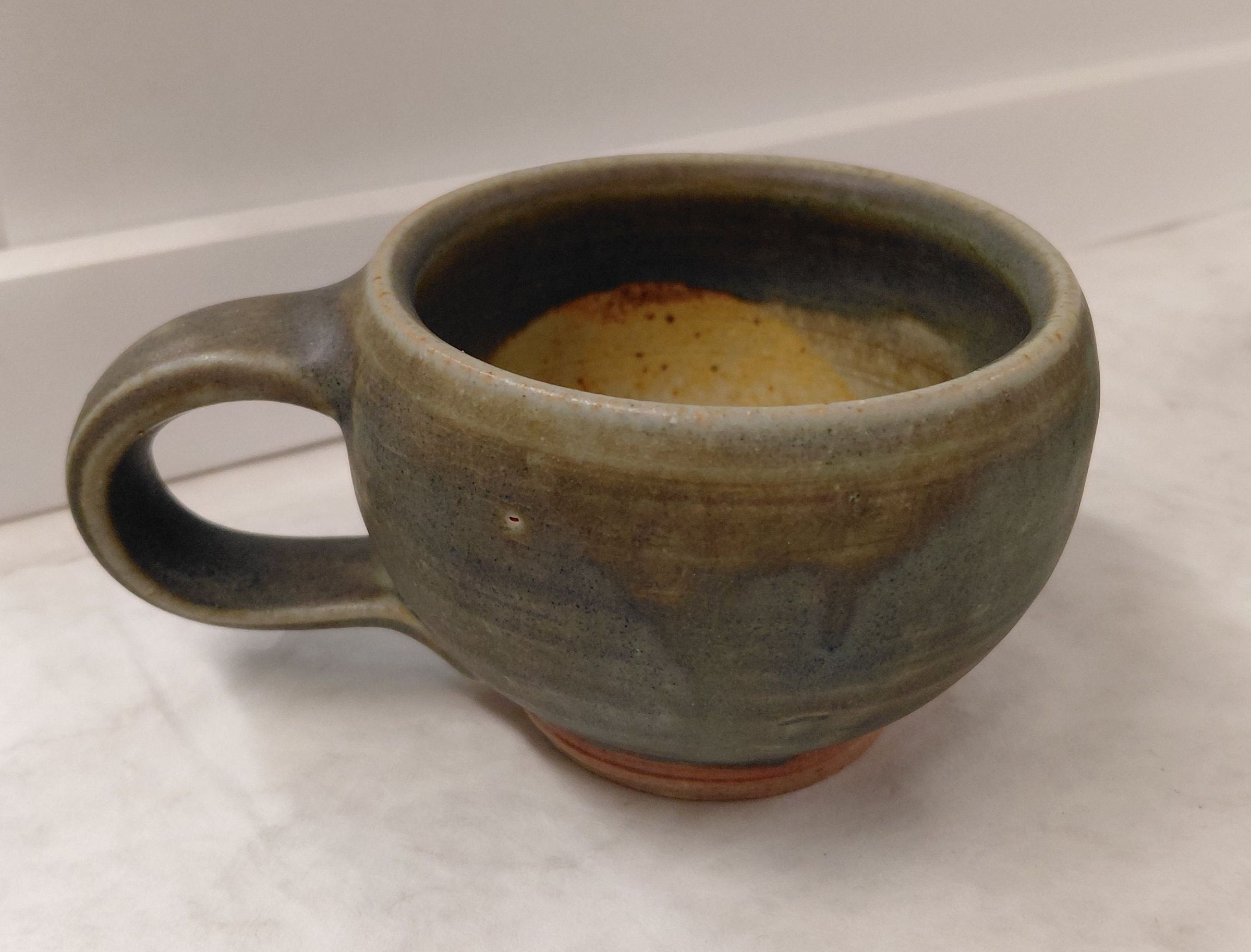 Glazed stoneware. Short, round mug. Blue/green in color. Inside is yellow speckled with brown. Long handle with a slight droop.Made/Created