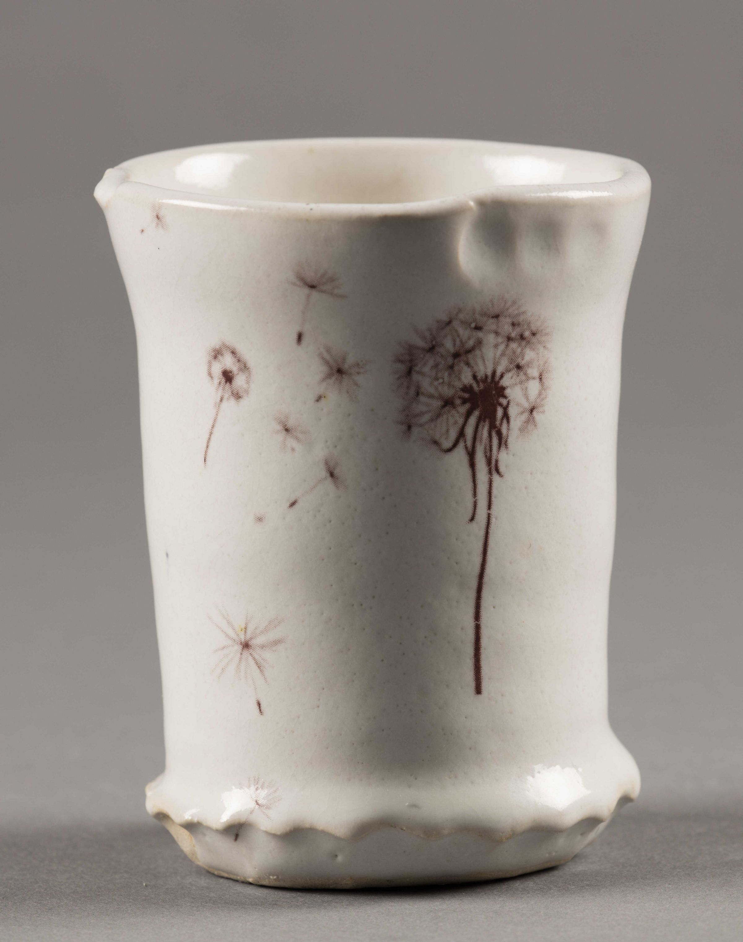 Glazed white stoneware with oxide decal. White with scalloped edge on bottom, creating a fringe of sorts. Red colored decal of a dandelion blowing in the wind decorates the exterior.Dimensions