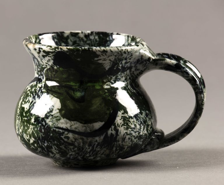 Porcelain with slips and oxide. Widely rounded as a whole, slight hourglass opening at top. Wide looped handle. Glazed with dark green and white marbled together with black linear forms over top.Made/Created