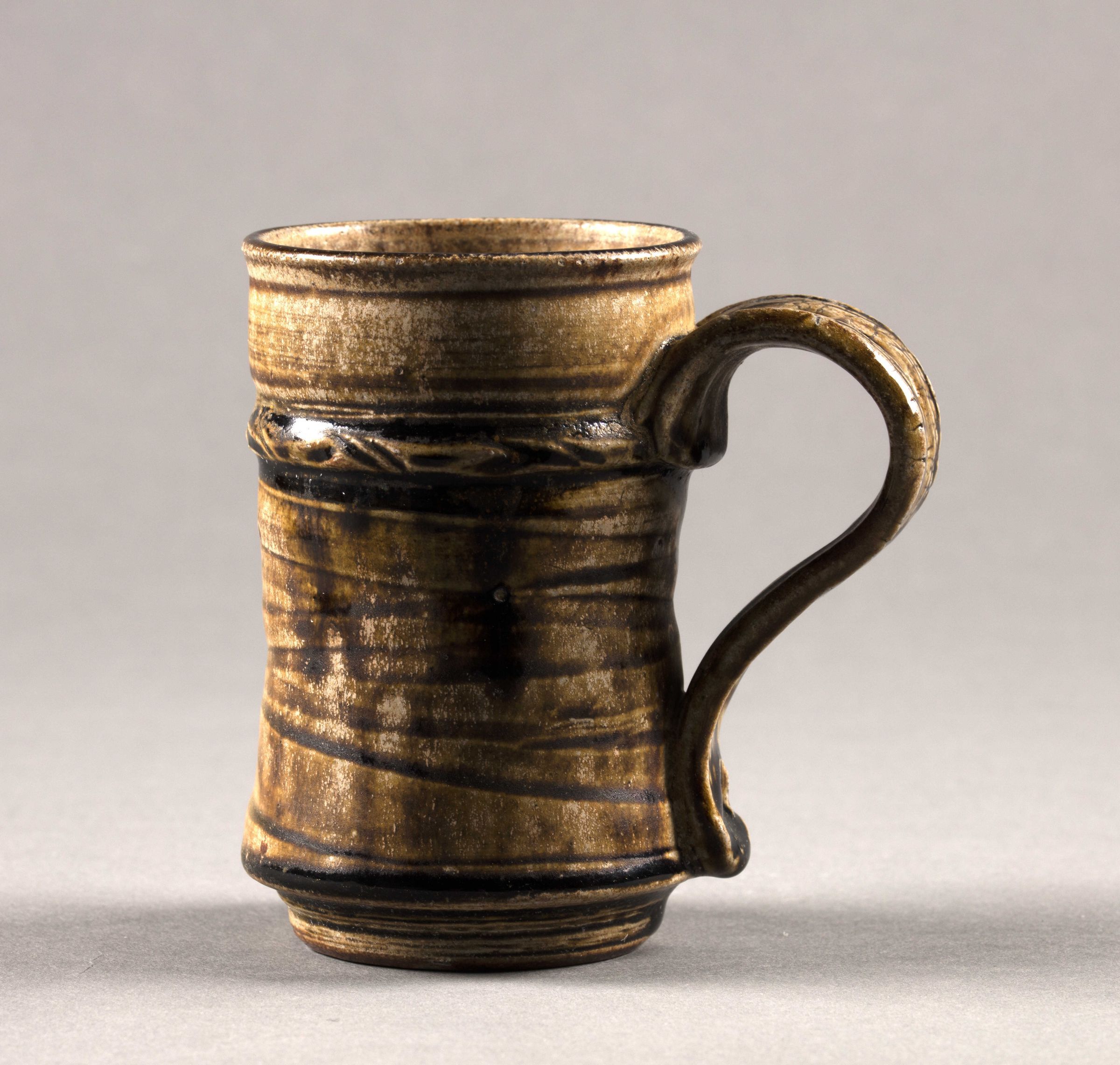 Glazed stoneware. Tall, brown and tan mug, half heart shaped handle. Horizontal lines decorating the exterior. At top of handle going around the exterior of the cup is a ridge decorated with vertical lines. Pockets of glaze collect heavily in the ridges of the cup.Made/Created