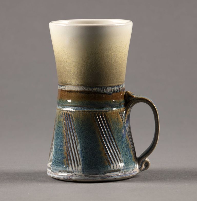 Glazed stoneware. Hourglass shape with looped handle connected to the lower half. Light cream color on top half with gradient to grey. Bottom half has a mixture of blue and brown with directional diagonal textured design. Interior is smooth and cream colored.Made/Created