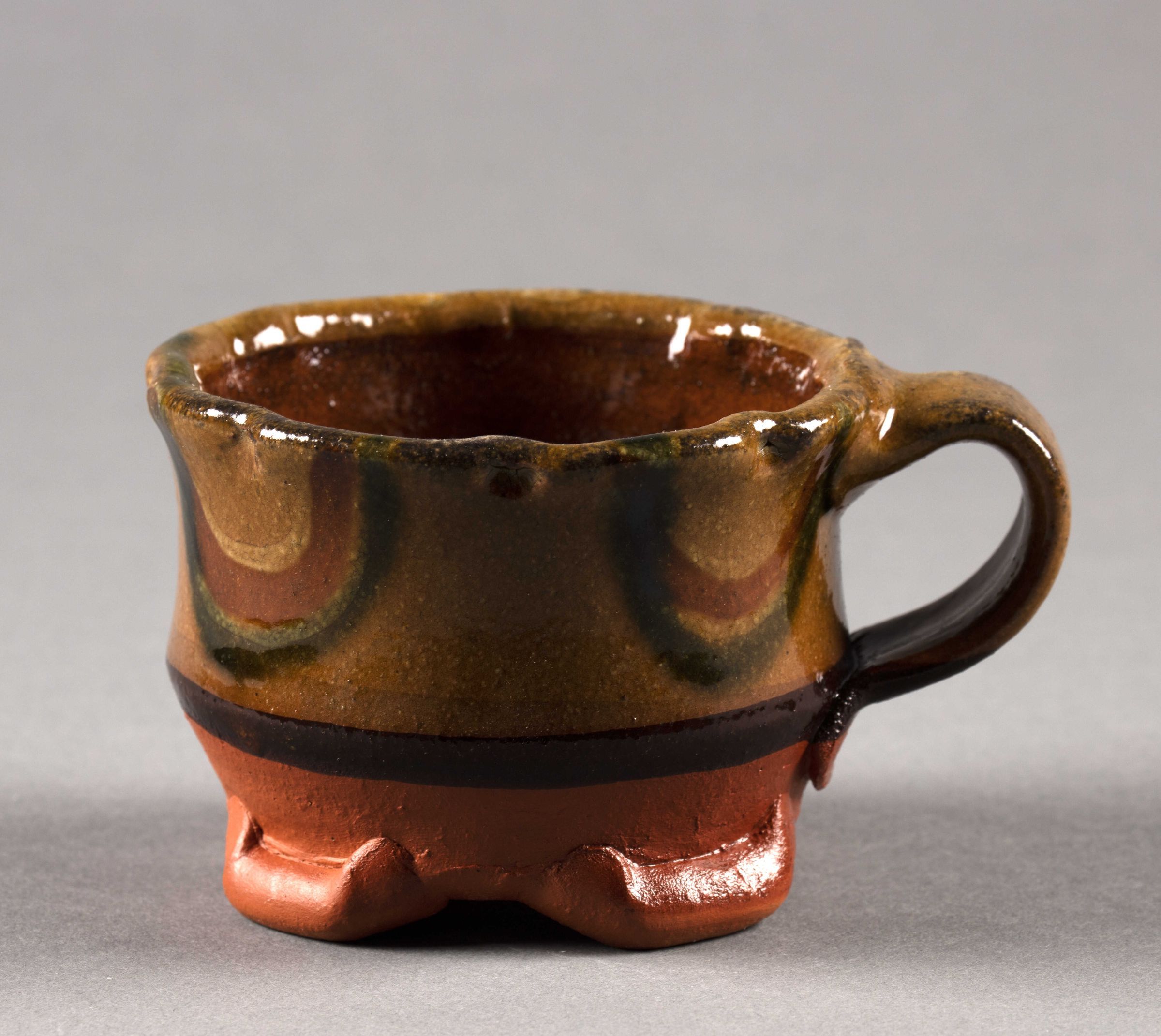 Earthenware with glaze and oxide wash. Orange colored short mug, four rectangular feet around base. Semi circles extending from rim on outside in red/black. Slightly scalloped rim. Black line separating glazed section at top and clay section on bottom.Made/Created