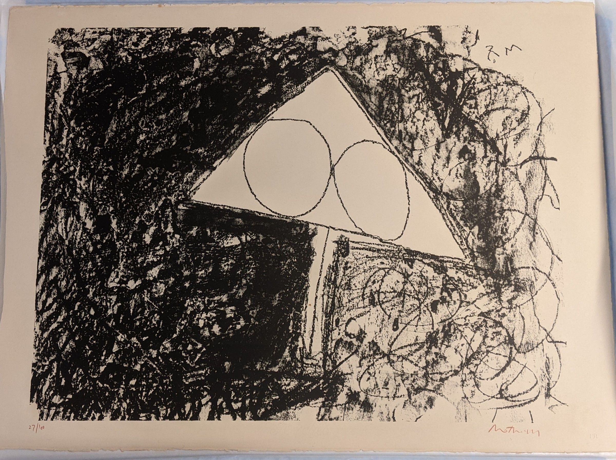 Triangle with two circles inside on center of page, rectangle from center of triangle to bottom edge of page. Background moves from overall black with little white on right side and gets lighter to the left, left side has noticeable swirls in background.Edition