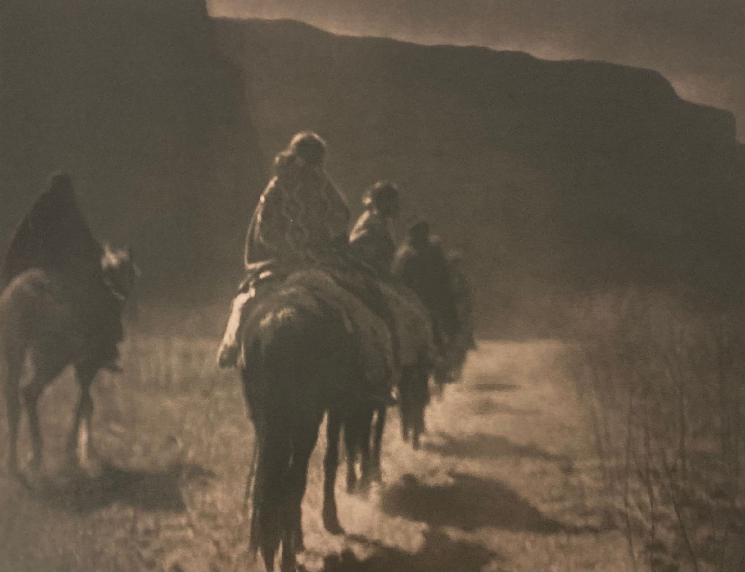 Matted artwork. A row of people on horseback riding away from the viewer. Rider on horse to left of line.Edition