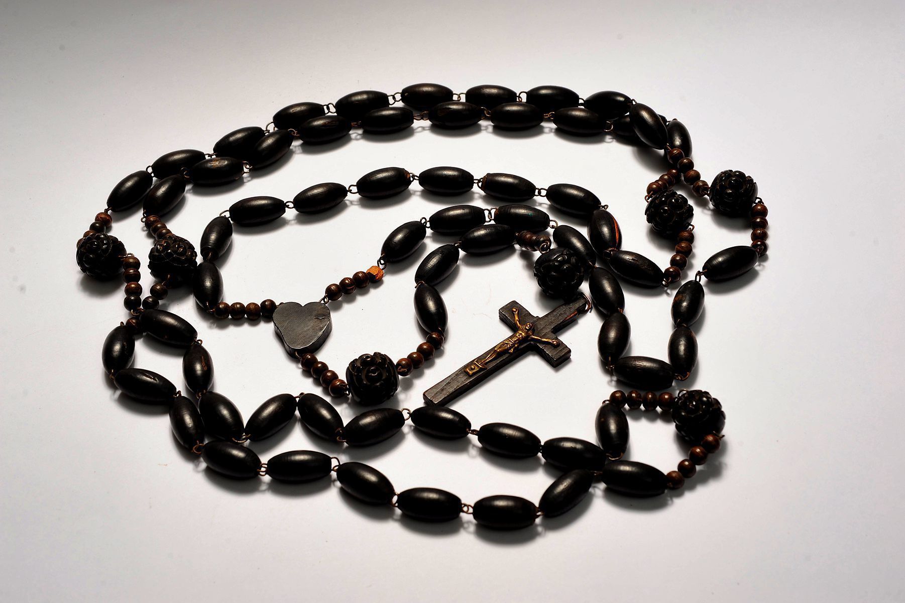 Wooden rosary used by the women of the Bailly household. The beads, including the seven large rose blossoms where the Lord’s Prayer was recited, are made from rosewood, a dense and aromatic wood that is often polished and fashioned for purposes with regular tactile handling.Use