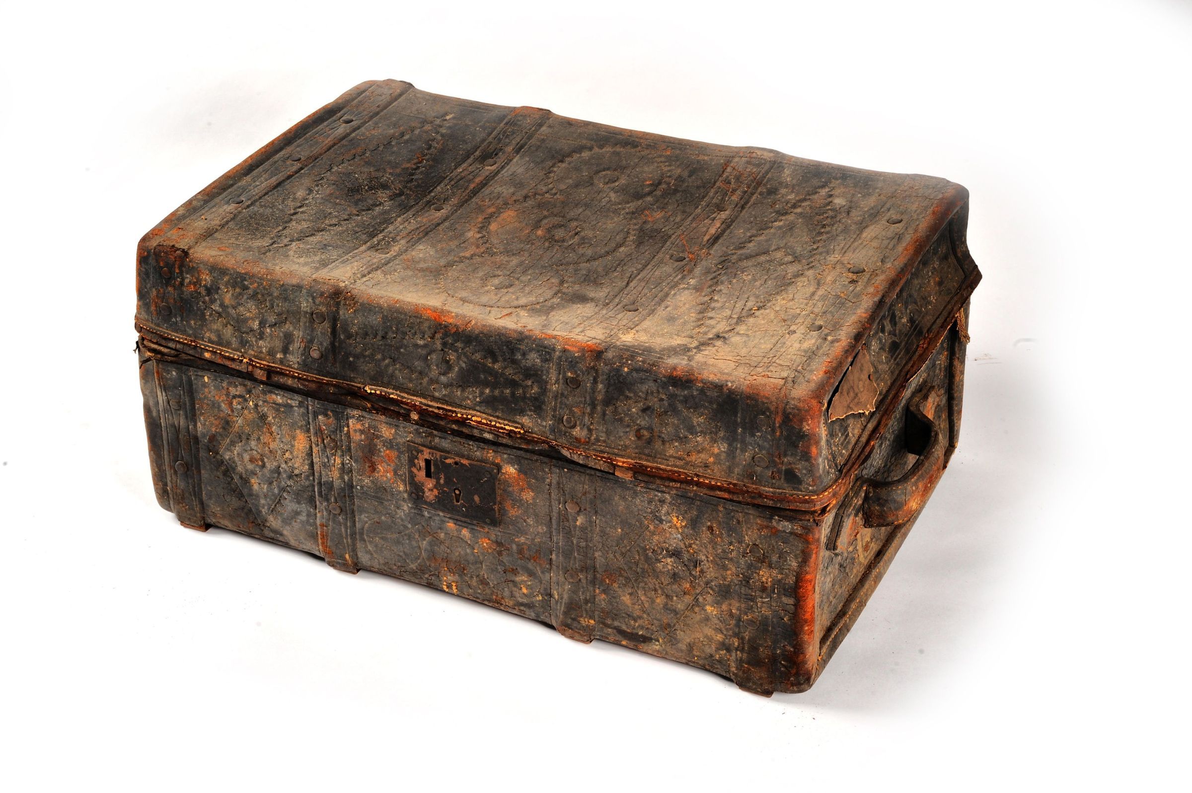 Trunk with decorative tooled leather exterior and striped cloth interior lining.Use