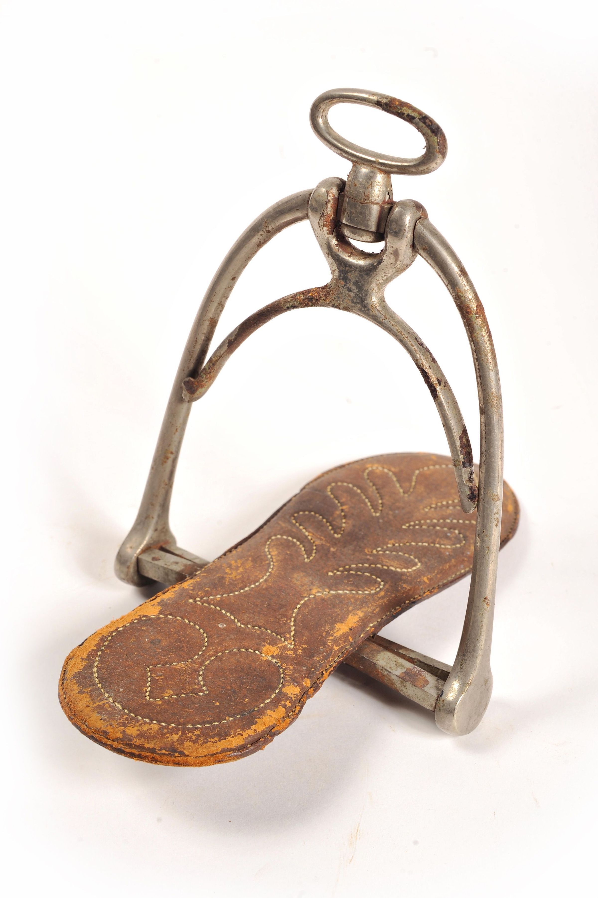 Metal stirrup with stitched design sewn in brown leather footing used by accomplished equestrian Rose Bailly. This traditional stirrup design has three main parts: an eye, a platform, and two arms. The eye is the loop at the top that attaches the stirrup to the saddle with a strap, the platform is the flat base that the rider places their foot on, and the arms are the sides that connect the eye to the platform.Use