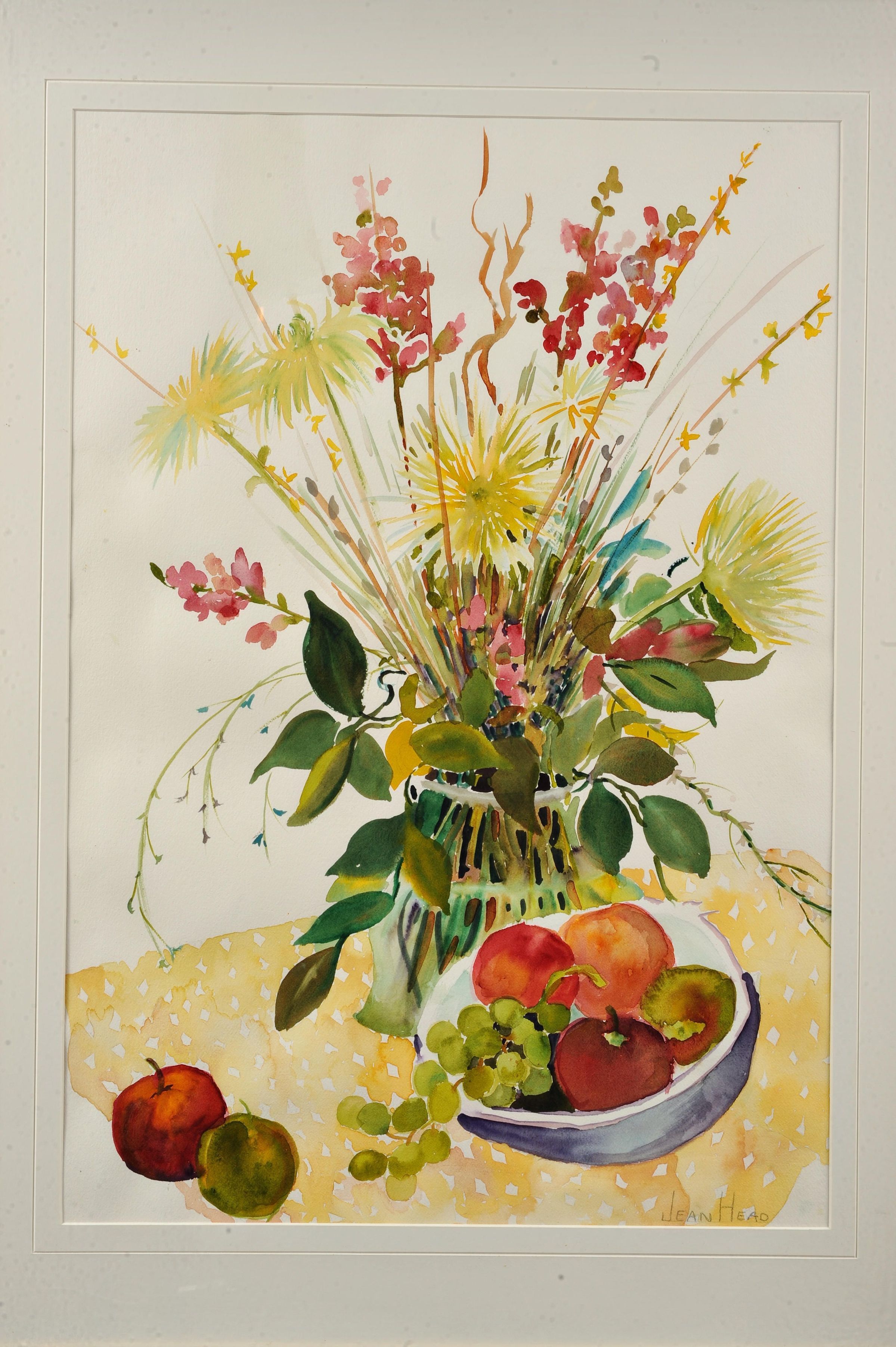 This painting titled "Celebration" by Jean Head depicts a bouquet of flowers and a bowl of fruit.