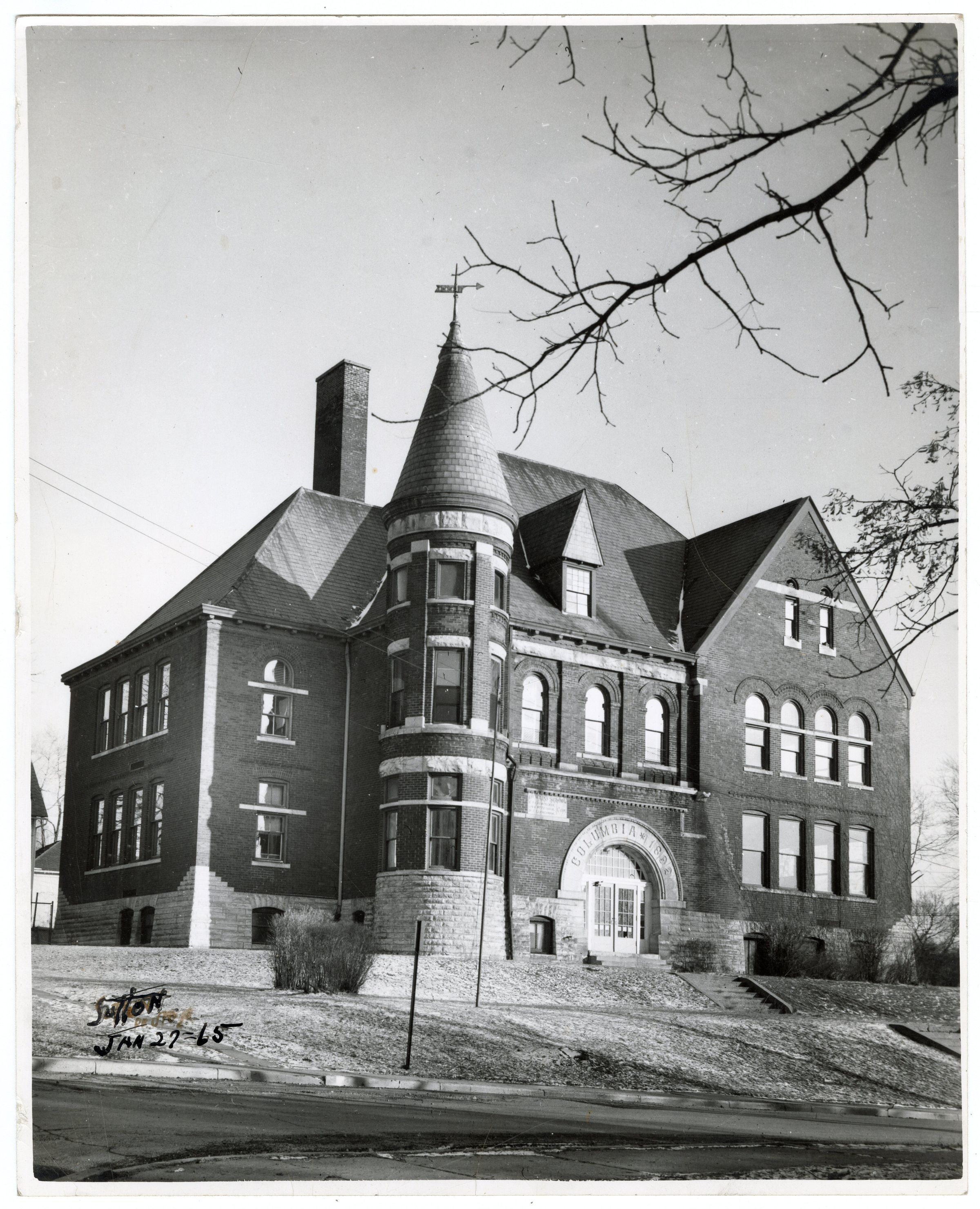 Black-and-white photograph of Columbia School, also known as 1st Ward School. Photograph is signed by photographer "Sutton" and dated January 27, 1965.Context