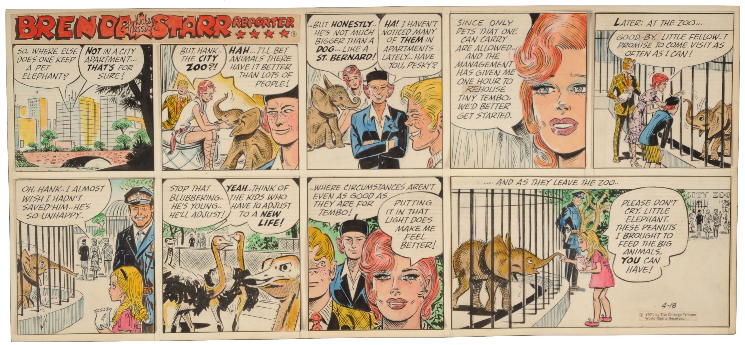 This pen-and-ink drawing painted with watercolor by Dalia “Dale” Messick was made for the Brenda Starr, Reporter multi-panel daily comic published on Sunday, April 18, 1971. This sequence shows Brenda Starr, Hank O’Hair, and Pesky Miller bringing a baby elephant named Tembo to the city zoo. Each panel was illustrated, painted, cut-out, and glued onto a paper in preparation for publication.Type of Drawing