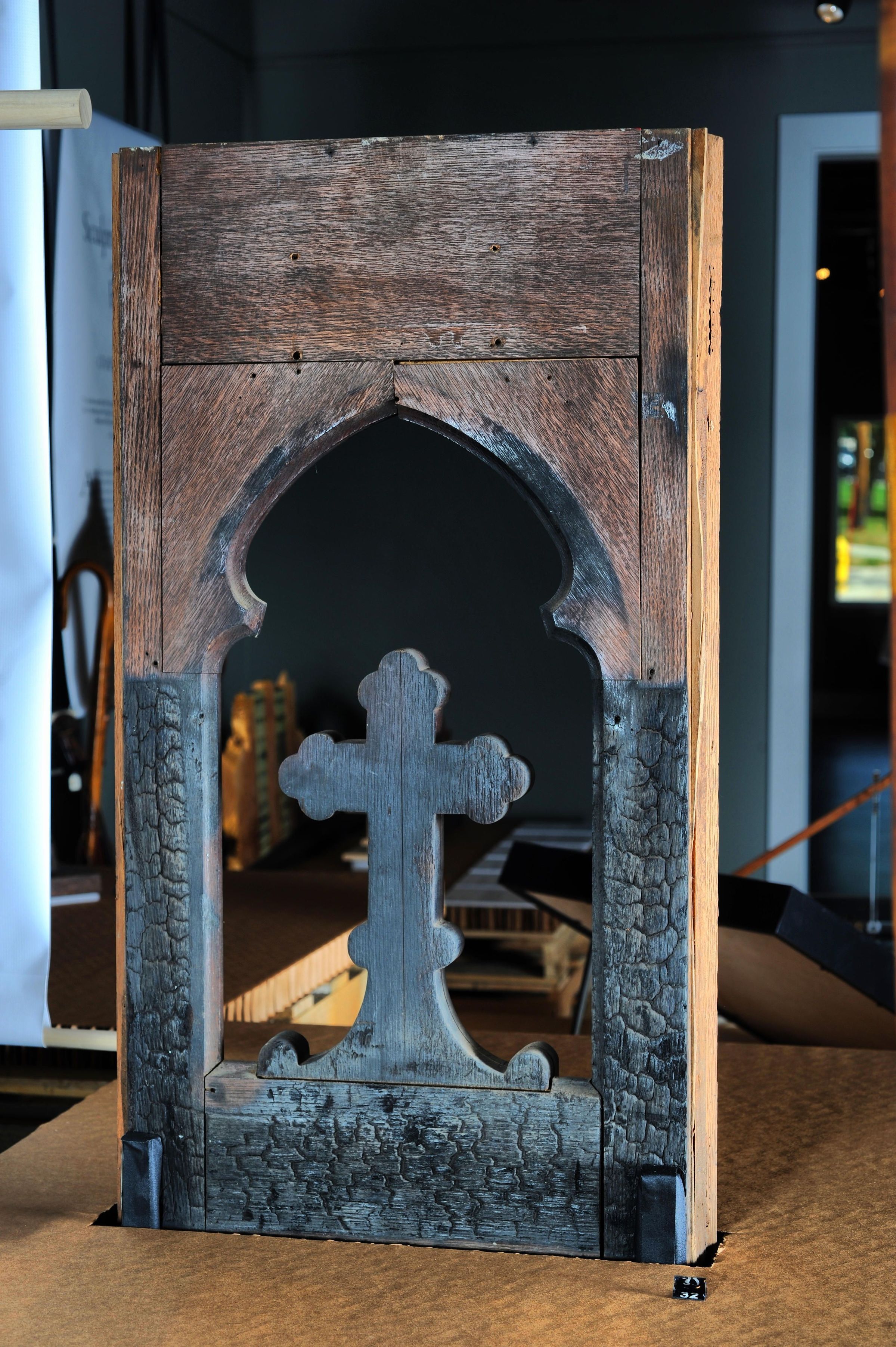 Pine and oak pulpit panel featuring a cross under an archway. It is charred from significant fire damage.Context