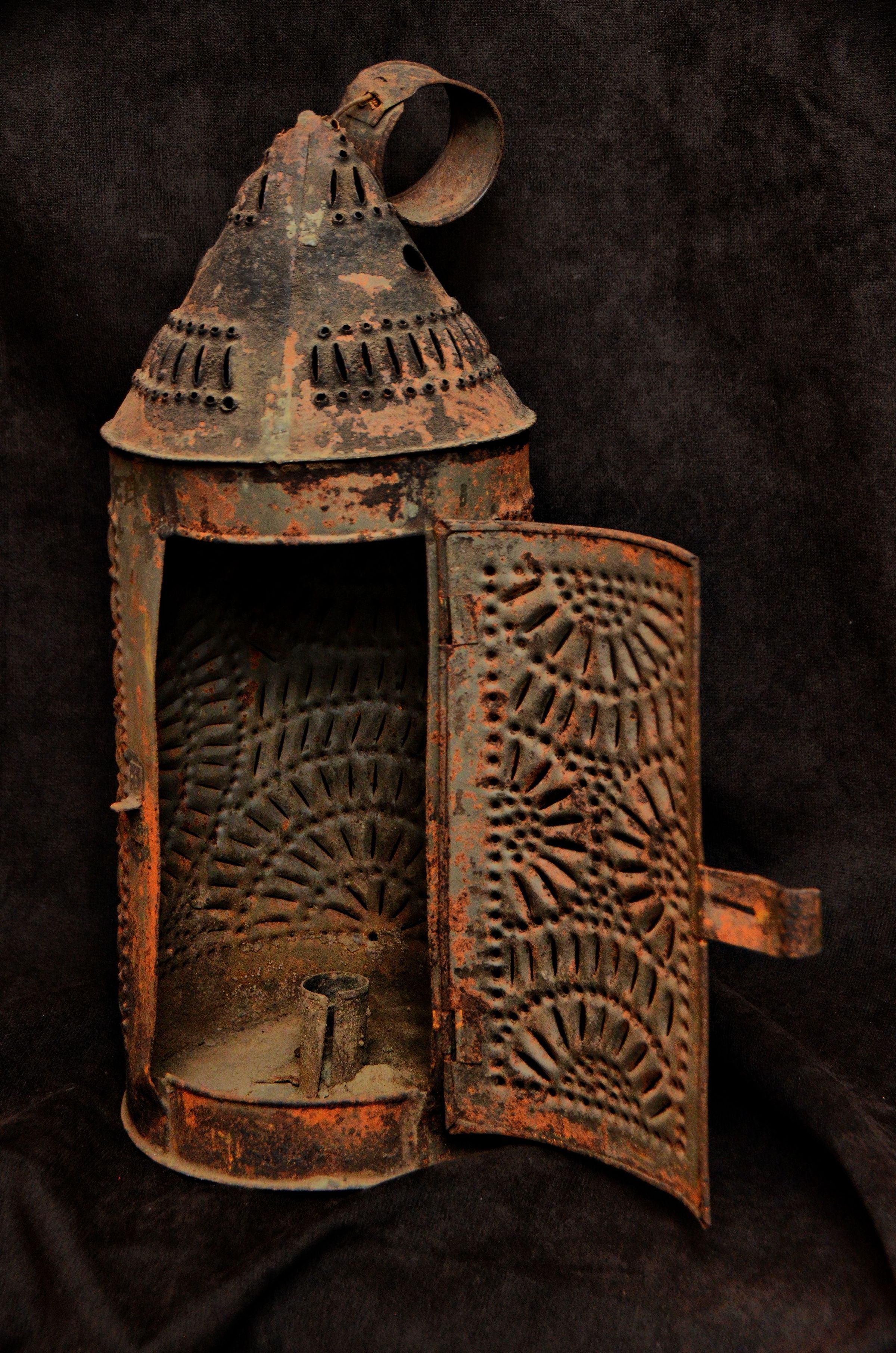 The small holes in this lantern do more than just cast intricate shadows. Punched into the tin sides with the tip of a nail, the holes served a practical function, allowing air to reach the flame while still sheltering it from gusts of wind. Additionally, the enclosure helped prevent the fire from spreading if the lantern tips over. These features allowed the lantern to be used outdoors and to transport a lit candle without extinguishing its flame.