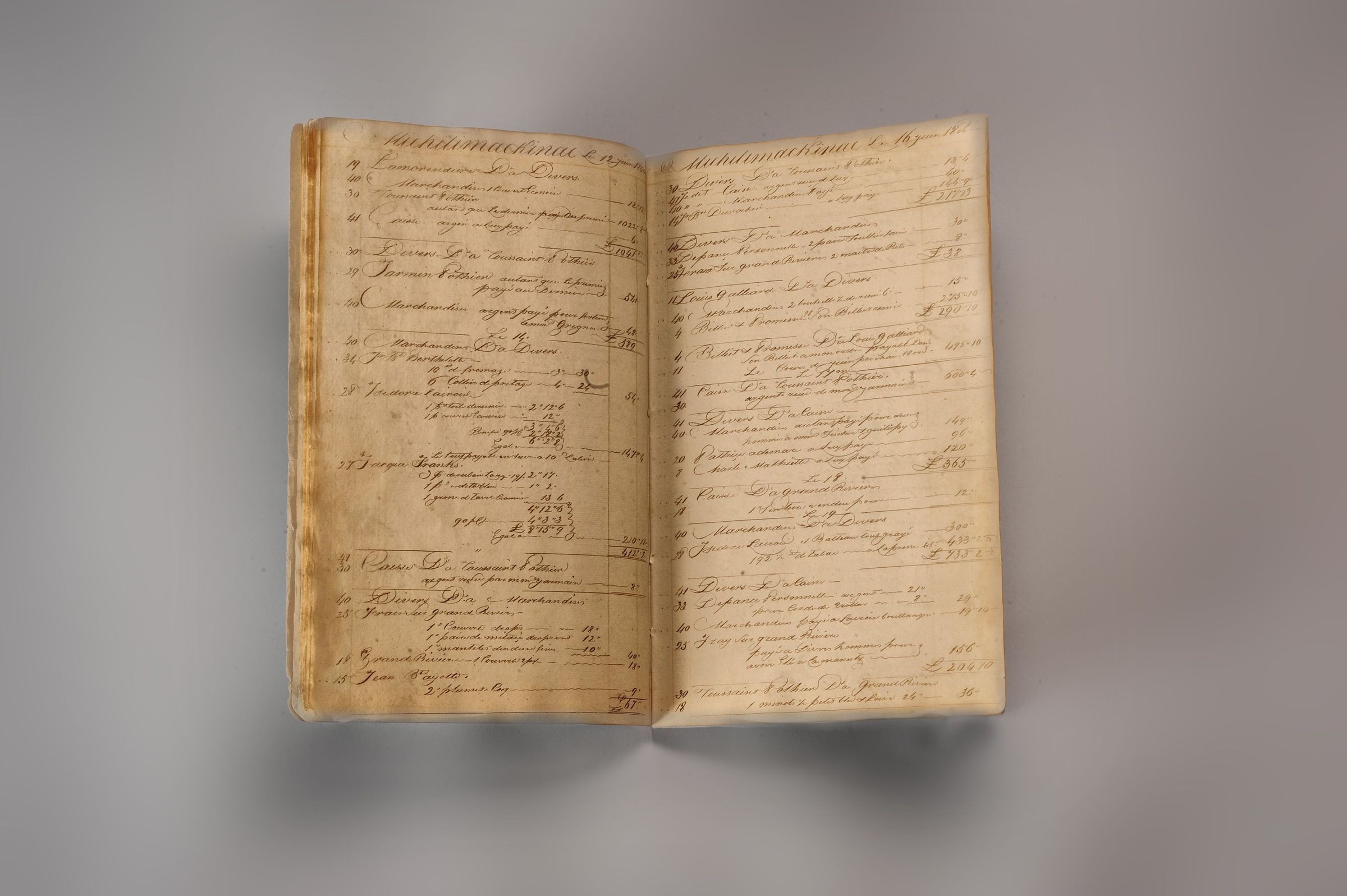 Joseph Bailly's accounting "daybook," or "journal" in French. The book, handwritten entirely in French, is 88 pages long and lists what Joseph Bailly bought and sold between February 1799 and May 1802 as a fur trader at Fort Michilimackinac in northern Michigan.Context