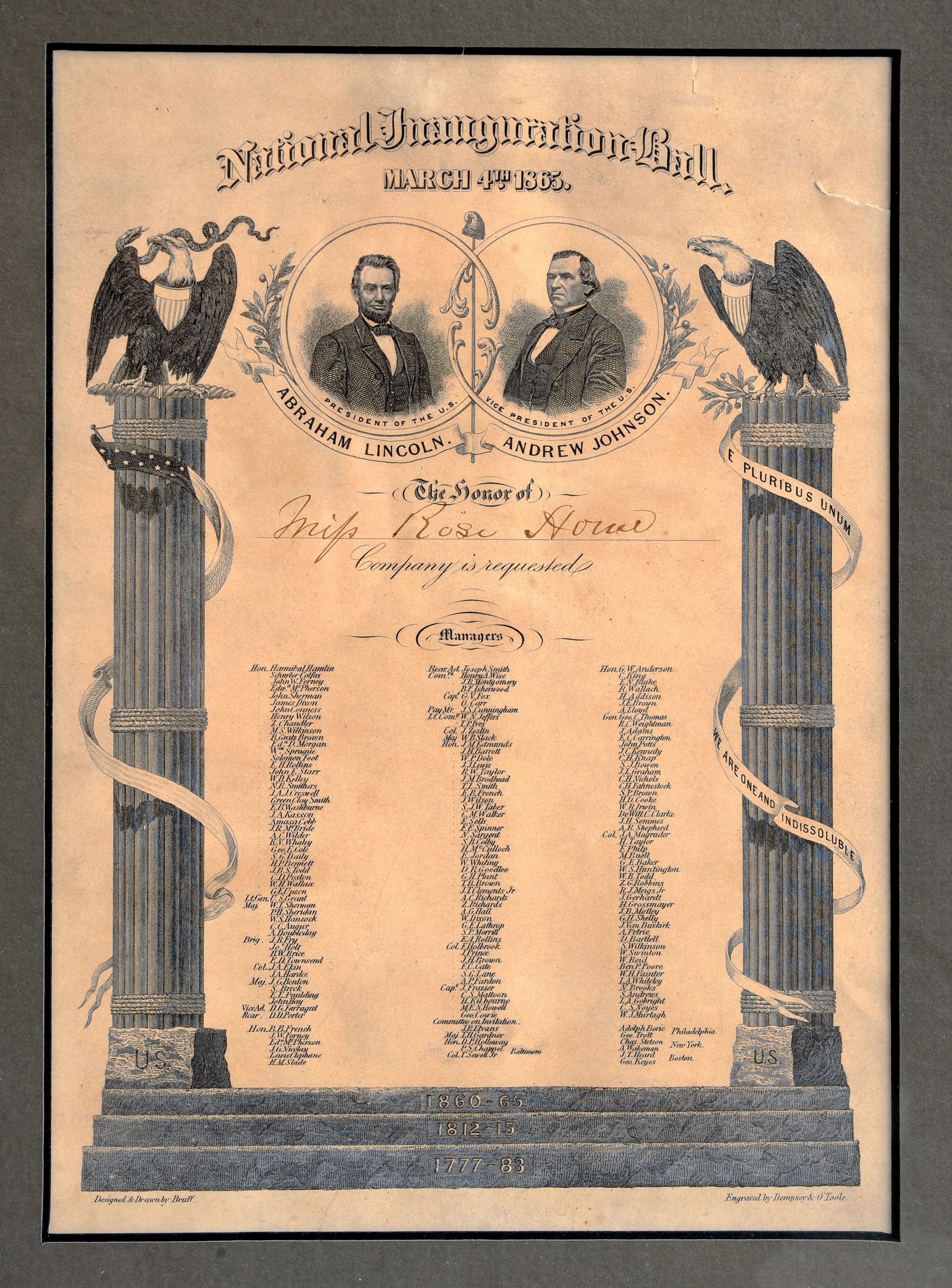 Invitation to President Lincoln's national inaugural ball addressed to Miss Rose Howe. The intricate design features portraits of the president and the vice president.Context
