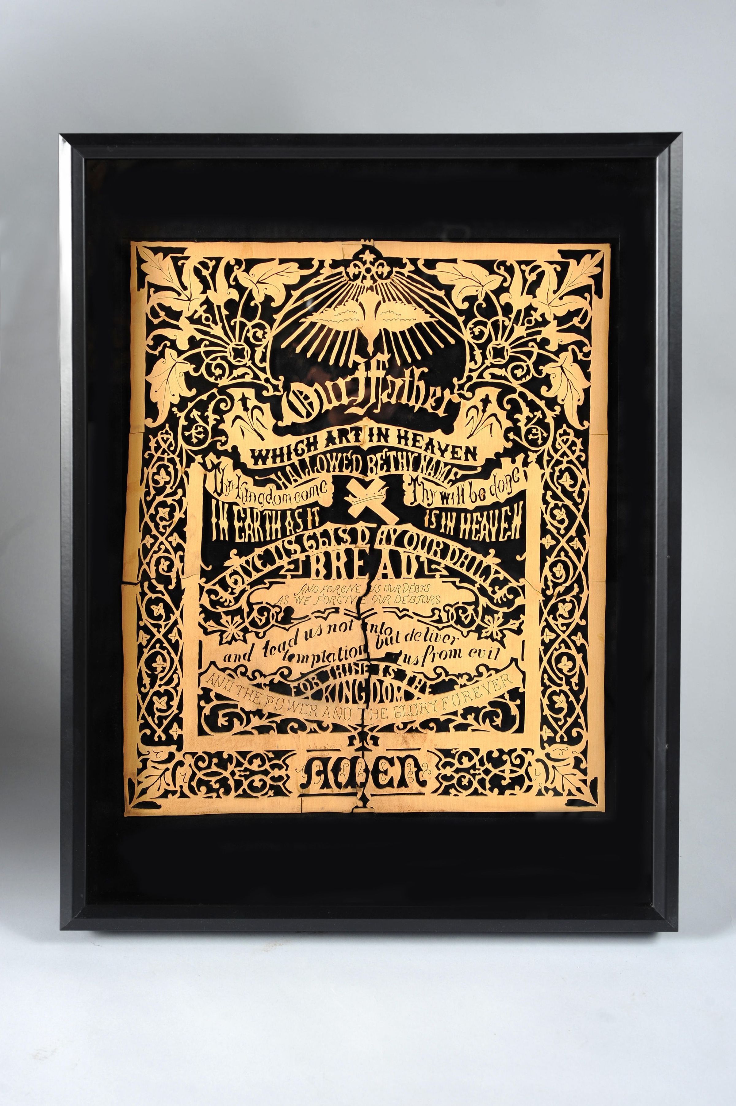 This carved plywood plaque by August "Gus" Miller depicts the words of the Lord's Prayer surrounded by elaborate decoration.Context