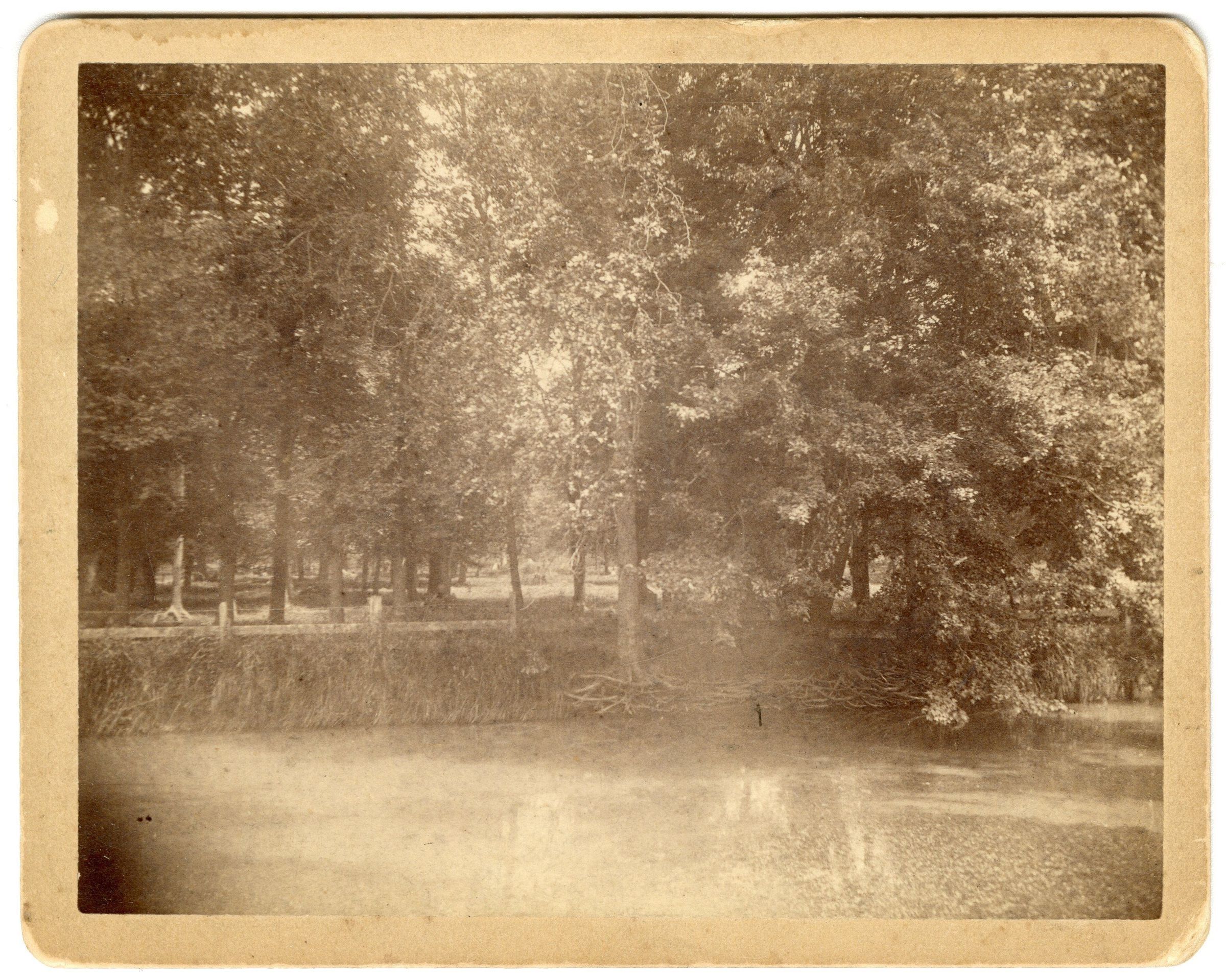 No. 1 On the other side of the river as the road approaches the house it winds down a hill and comes close to the river. Just at the foot of this hill there is a view of a pretty landscape with the river for a foreground. The wooded meadow making the principal part of the landscape lies east of our house and is part of the property. Note the roots of the trees laid bare by the action of water during freshets.
