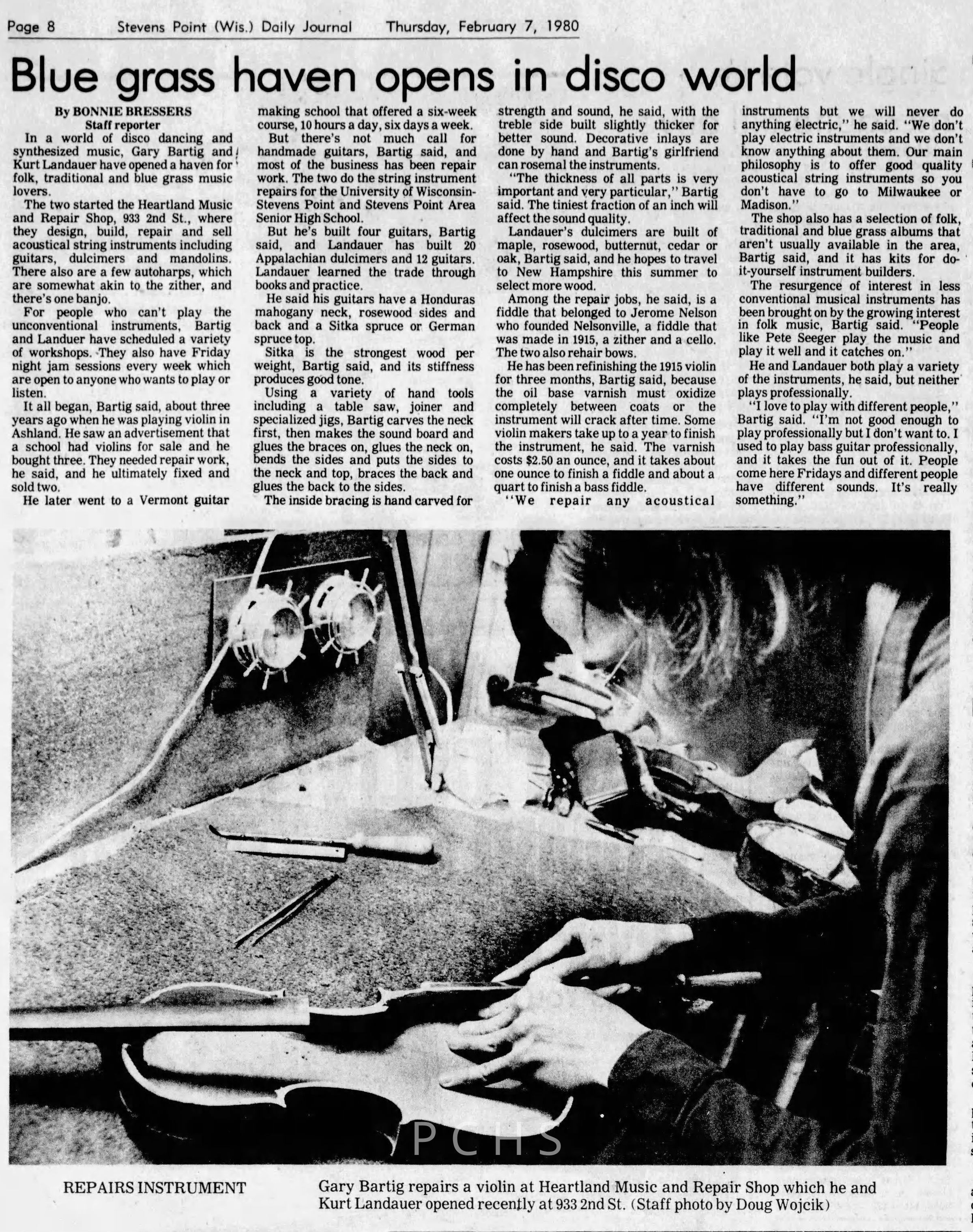 Newspaper articles ranging from 1978-2001, covering the history of the Heartland Music and Repair shop and the owner, Gary Bartig.Created By