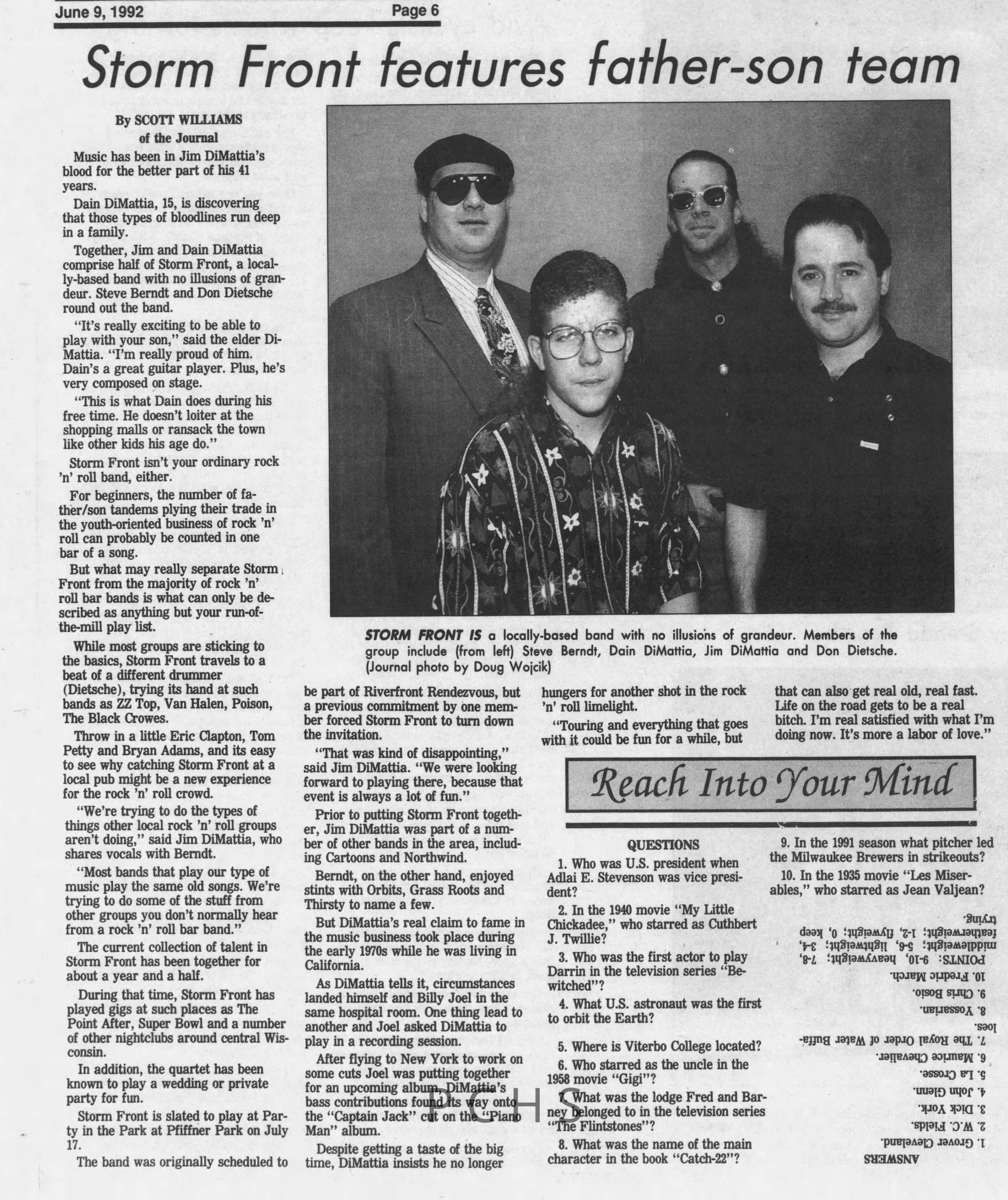 Storm Front was a 4-man rock 'n roll band from Stevens Point. Father Jim DiMattia (vocals and bass) and son Dain DiMattia (guitar) were joined by Steve Berndt (vocals) and Don Dietsche (drums) to play together. Jim DiMattia was featured on the "Captain Jack" cut on the "Piano Man" album by Billy Joel. The band was formed in early 1990.Created By