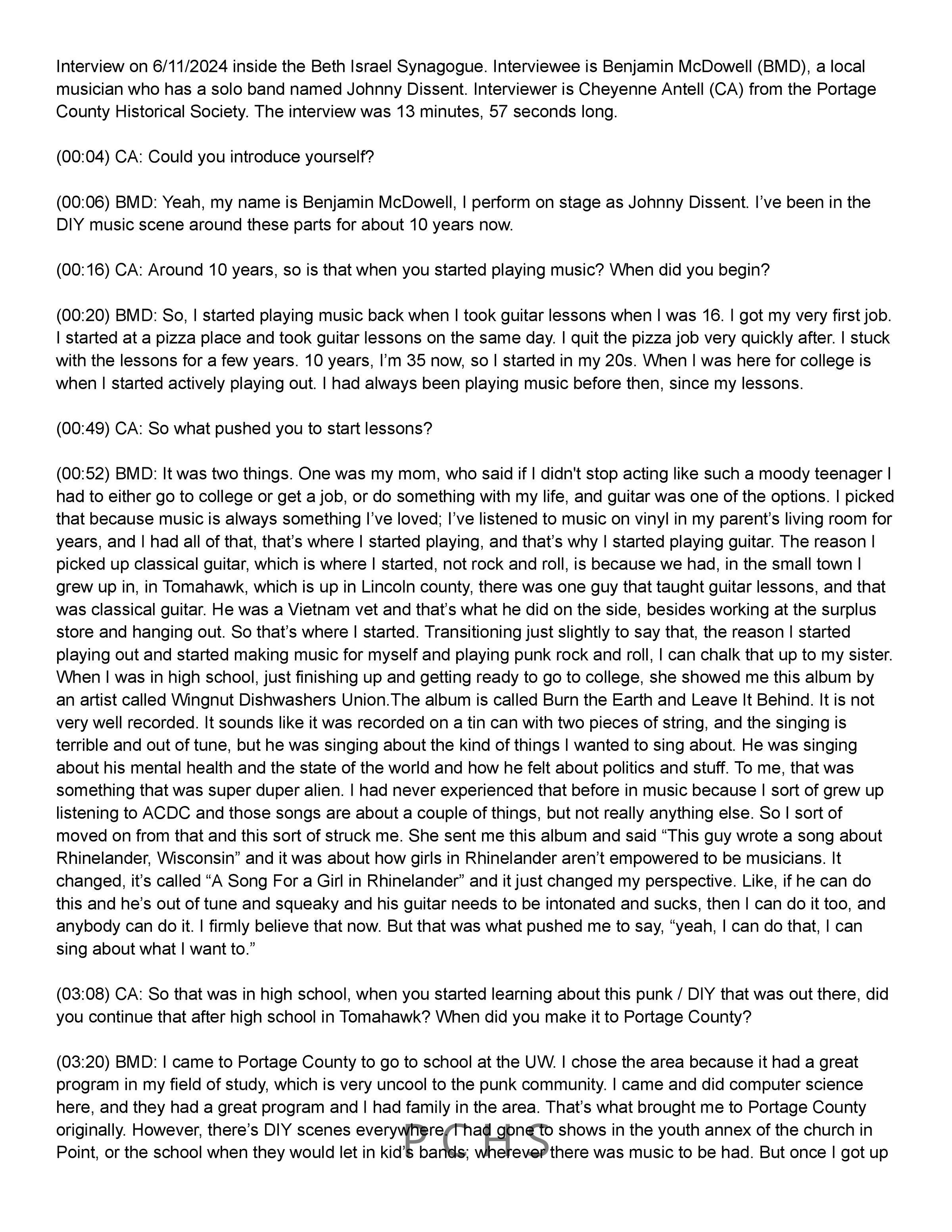 Interview on 6/11/2024 inside the Beth Israel Synagogue. Interviewee is Benjamin McDowell (BMD), a local musician who has a solo band named Johnny Dissent. Interviewer is Cheyenne Antell (CA) from the Portage County Historical Society. The interview was 13 minutes, 57 seconds long.Audio Format