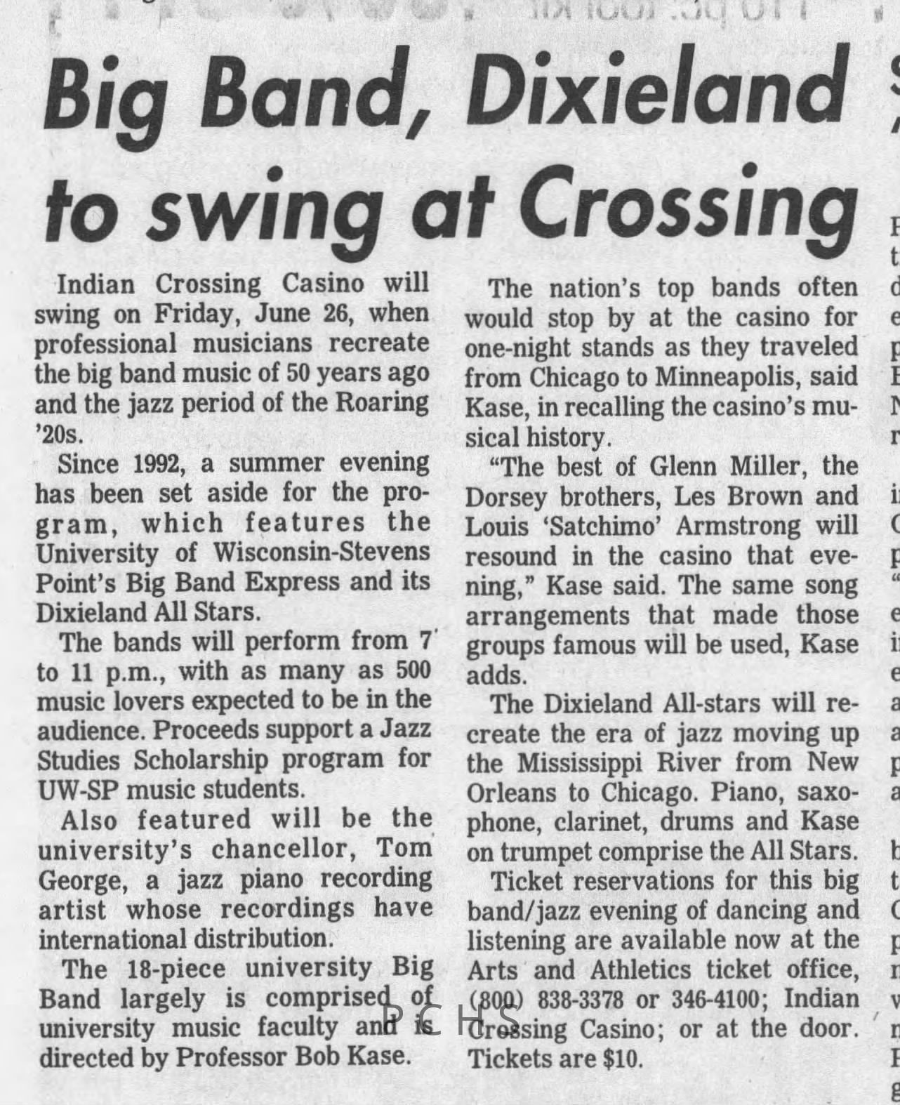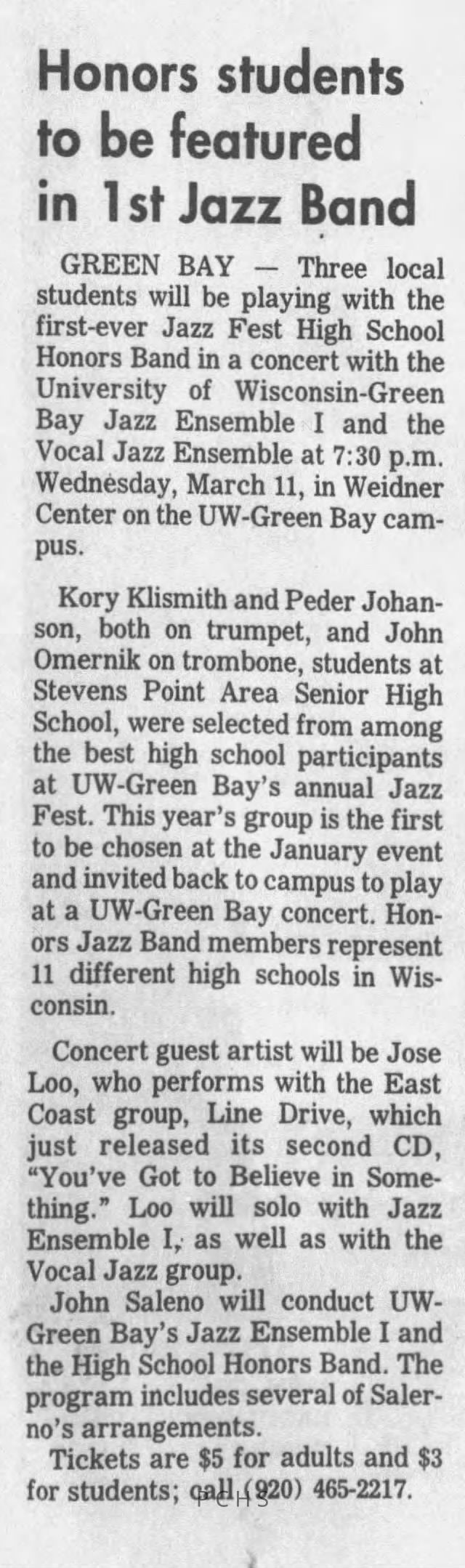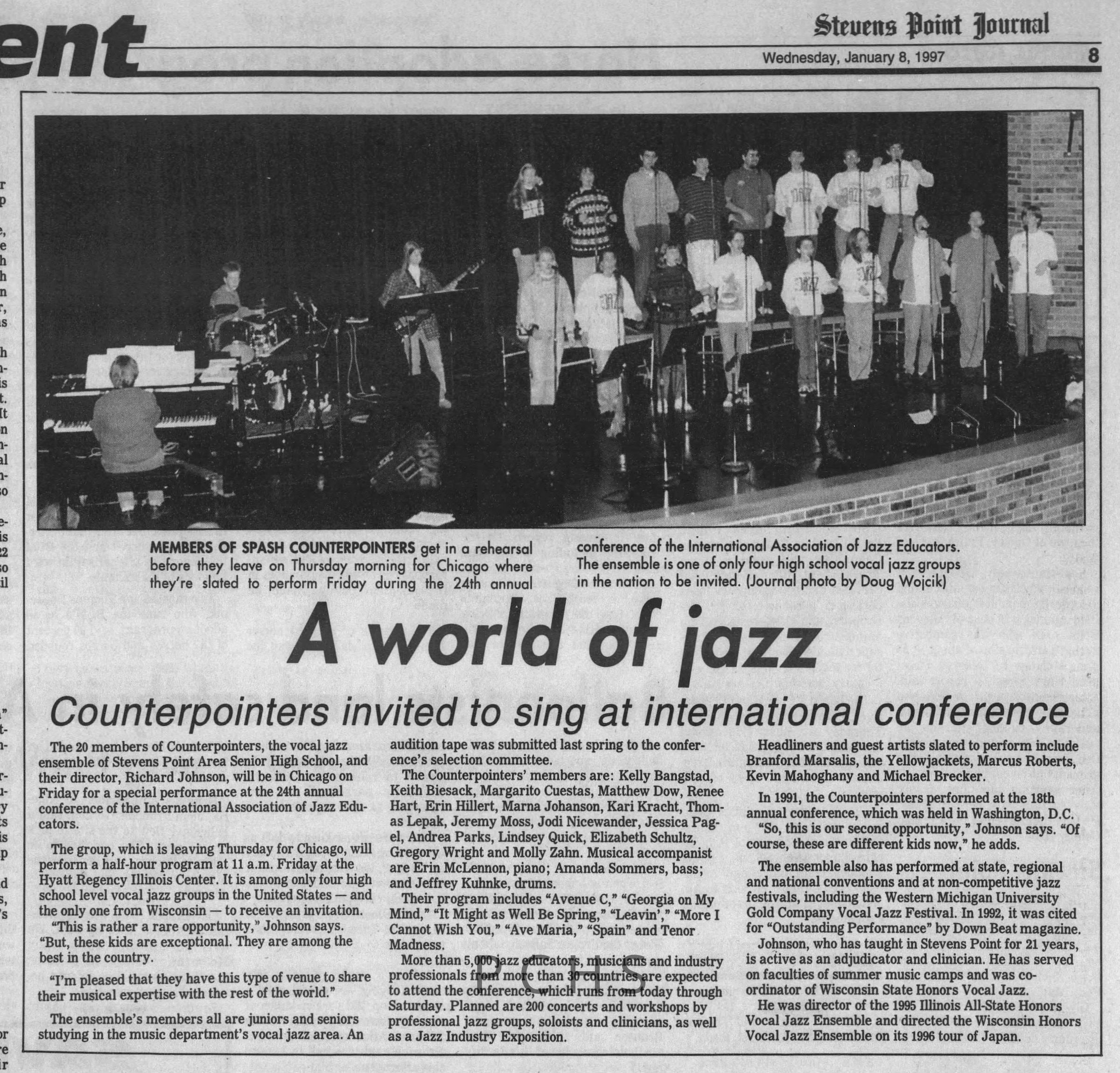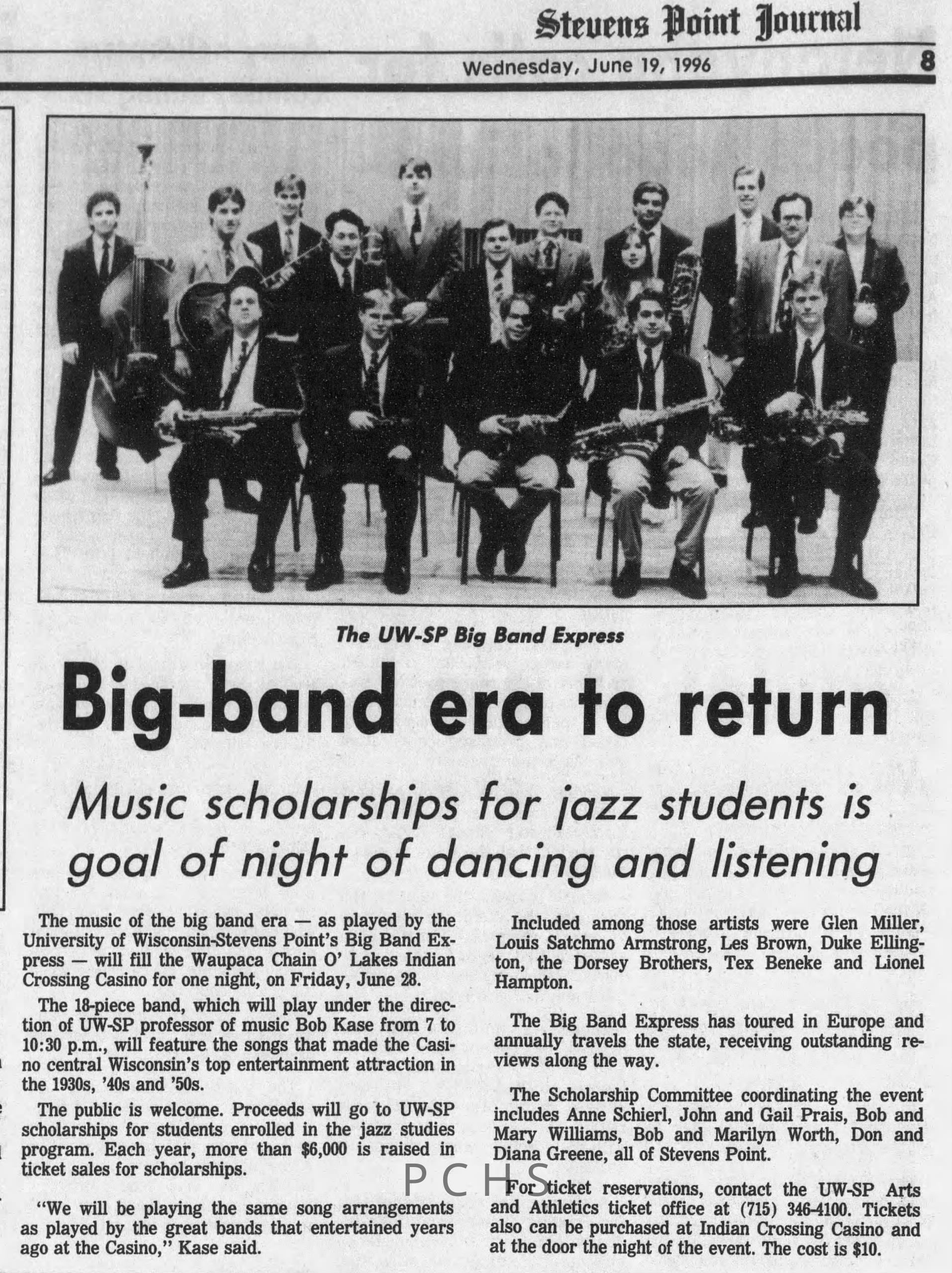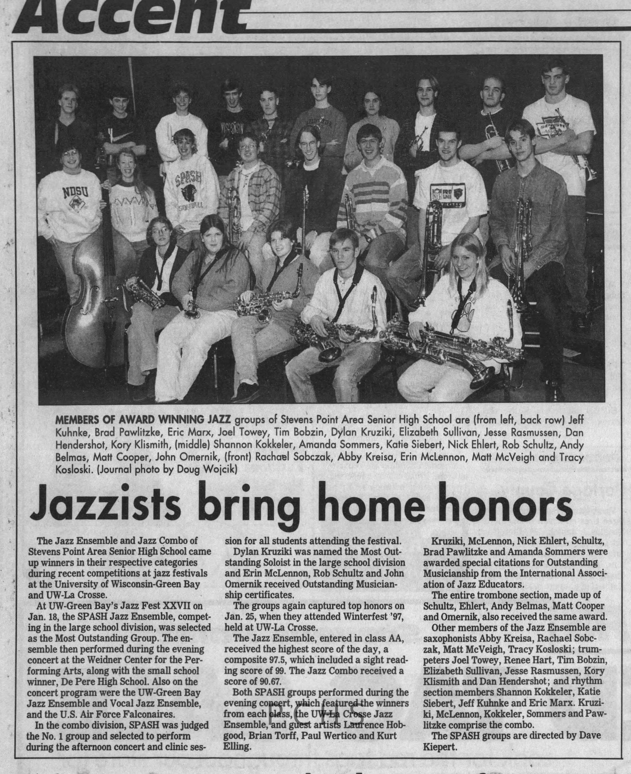 Newspaper clippings from Portage County newspapers. These clippings show jazz musicians, bands, events, school organizations, and traveling shows from 1996-2000. Some highlighted topics are Shawn Sommer, SPASH jazz ensemble, Don Chesebro, Thomas George, Rosholt, UWSP Mardi Gras Ball, CWSO, Poco a Poco, Don Greene, Ben Franklin Junior High, Riverfront Rendezvous, Dick Johnson, Almond-Bancroft, Todd Gustafson, Mike Metheny, John Greiner, John Altenburgh, Janet Planet, WWSP, jazzfest, Kip Gutke, Matt Dow, Bethany Ackeret, Counterpointers, PJ Jacobs, Big Band Express, Erin McLennon, Lindsey Quick, jazz lab band, Breanne Hetzel, Brian Reince, Matthew Antoniewicz, CWSO, Gold Company, David Hastings, Amanda Sommers, Laura Sommer, Jazz Point, Laura Caviani, Karrin Allyson, Soiree Musicale, Pacelli high school, Krazy Days, May Erickson, Wisconsin Christmas Jazz and Blues Show, Abbie Betinis, Greg Wright, Dave Kiepert, Jeff Erickson, Down Beat Ensemble, Pops Concert, Richard Johnson, Swing into Action, River Cities Jazz, Bob Kase Quartet, Don Chesebro Swing Quartet, Dennis Provisor.Created By