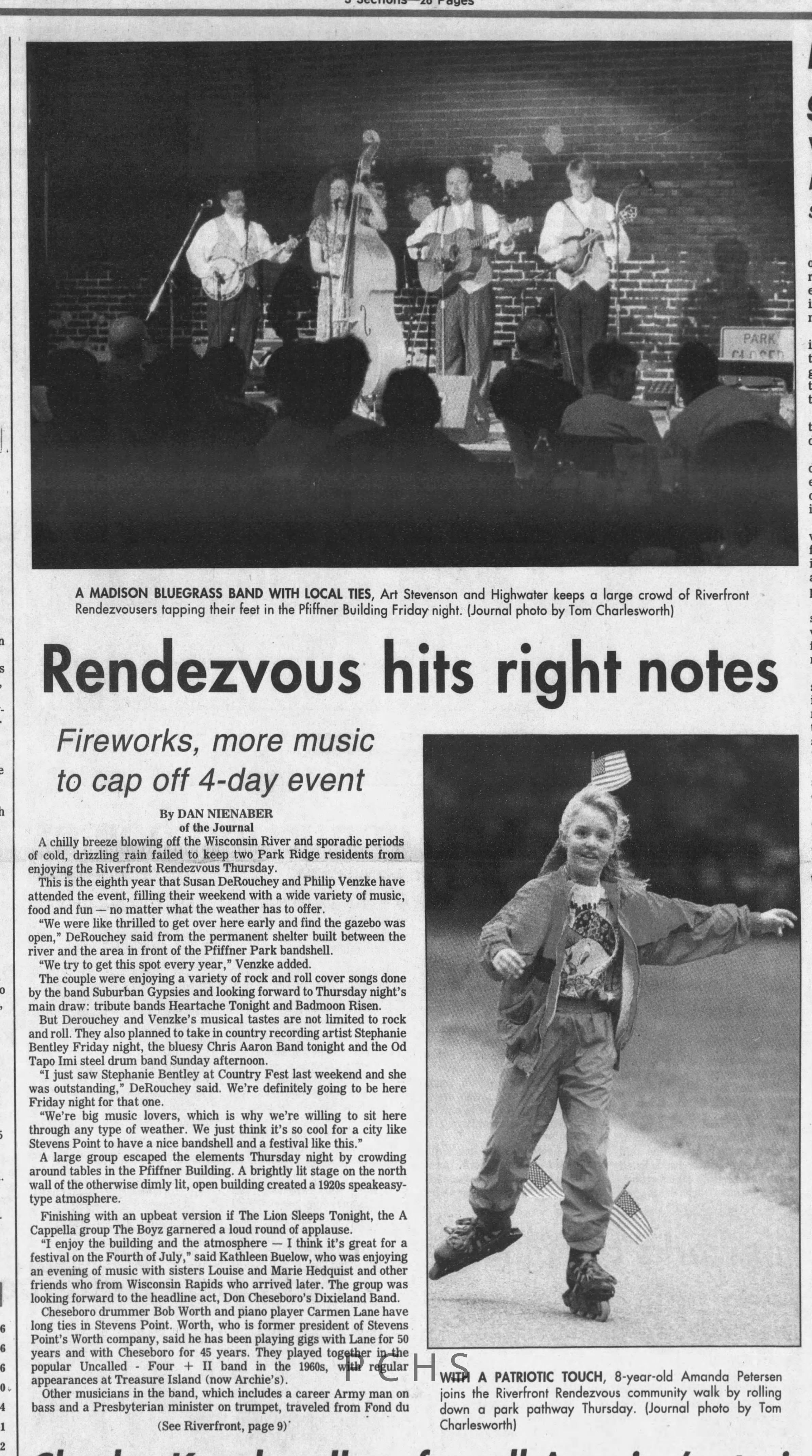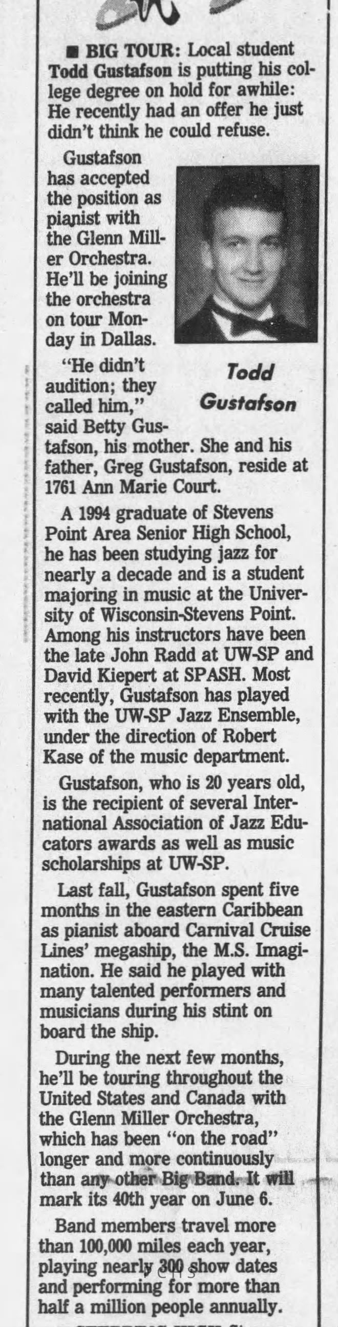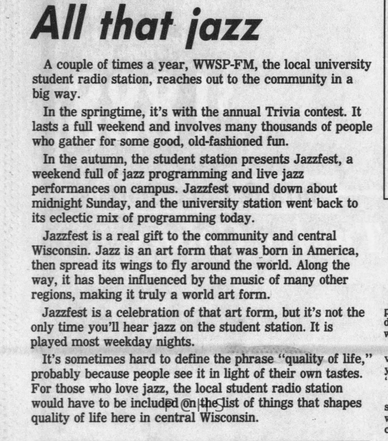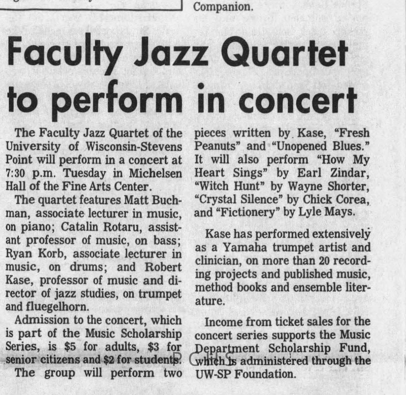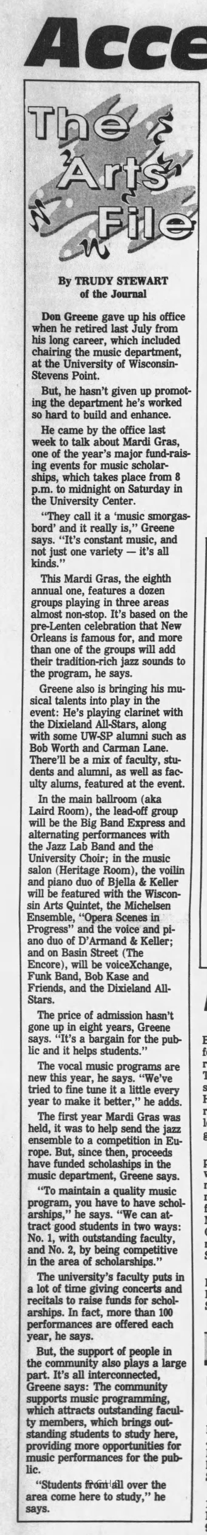 Newspaper clippings from Portage County newspapers. These clippings show jazz musicians, bands, events, school organizations, and traveling shows from 1996-2000. Some highlighted topics are Shawn Sommer, SPASH jazz ensemble, Don Chesebro, Thomas George, Rosholt, UWSP Mardi Gras Ball, CWSO, Poco a Poco, Don Greene, Ben Franklin Junior High, Riverfront Rendezvous, Dick Johnson, Almond-Bancroft, Todd Gustafson, Mike Metheny, John Greiner, John Altenburgh, Janet Planet, WWSP, jazzfest, Kip Gutke, Matt Dow, Bethany Ackeret, Counterpointers, PJ Jacobs, Big Band Express, Erin McLennon, Lindsey Quick, jazz lab band, Breanne Hetzel, Brian Reince, Matthew Antoniewicz, CWSO, Gold Company, David Hastings, Amanda Sommers, Laura Sommer, Jazz Point, Laura Caviani, Karrin Allyson, Soiree Musicale, Pacelli high school, Krazy Days, May Erickson, Wisconsin Christmas Jazz and Blues Show, Abbie Betinis, Greg Wright, Dave Kiepert, Jeff Erickson, Down Beat Ensemble, Pops Concert, Richard Johnson, Swing into Action, River Cities Jazz, Bob Kase Quartet, Don Chesebro Swing Quartet, Dennis Provisor.Created By